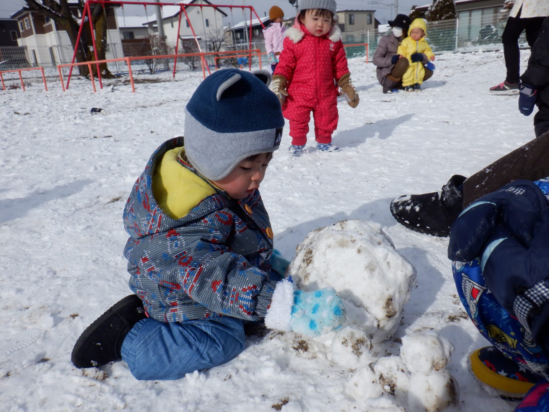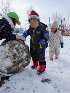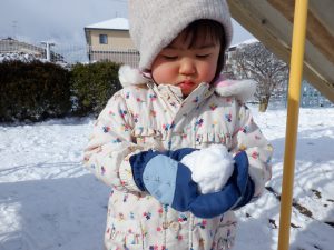 初めての雪遊びに、最初は戸惑ったり、雪が冷たくて泣けてしまう子もいました。