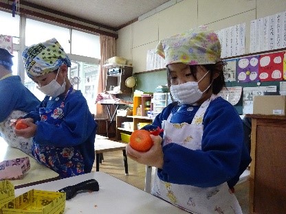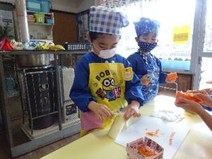「皮むき、むずかしいなぁ~」「しっかり おさえなきゃ」