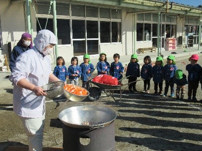 給食先生が大きな鍋で! みんなも「おいしくな~れ!」
