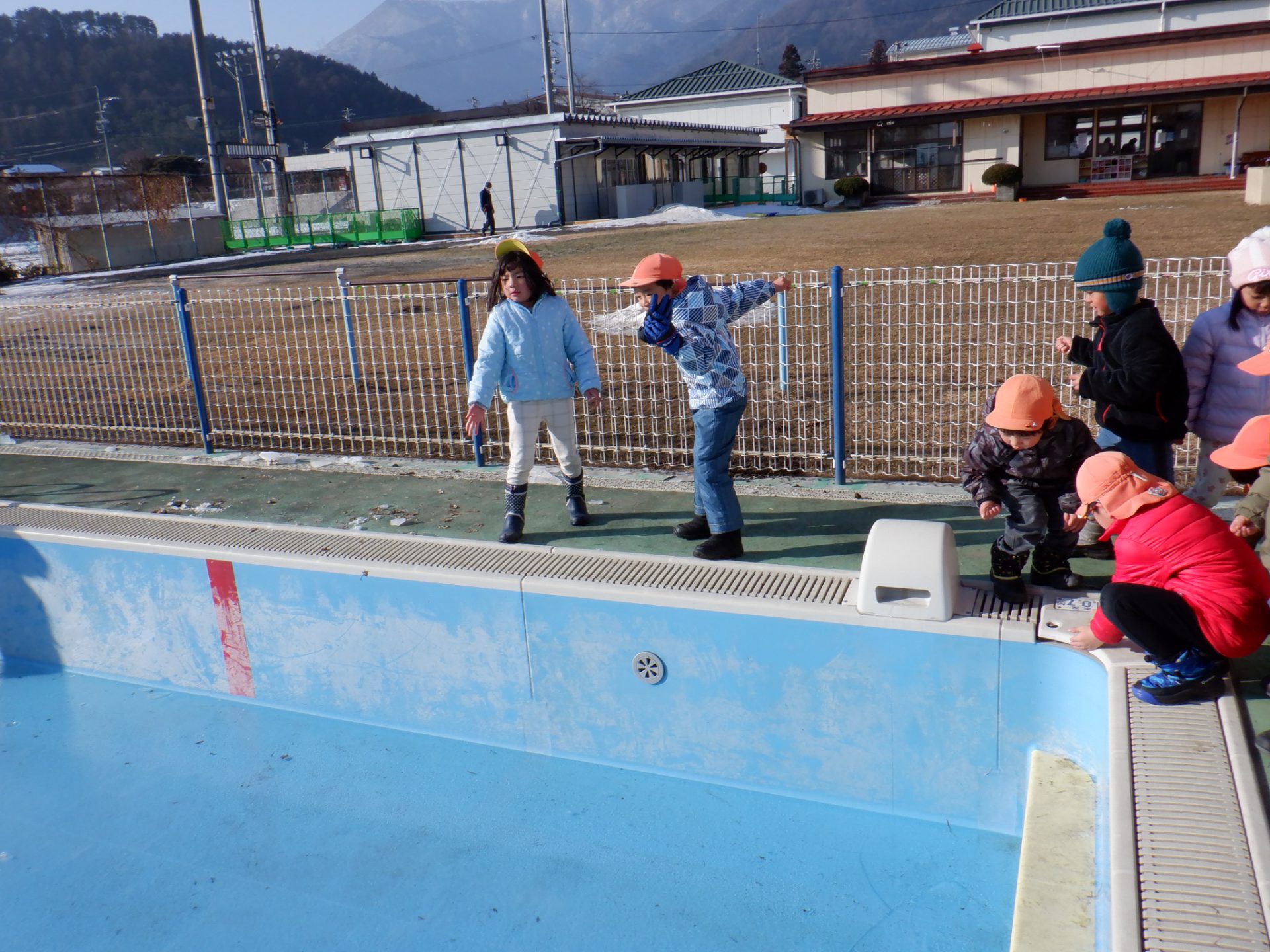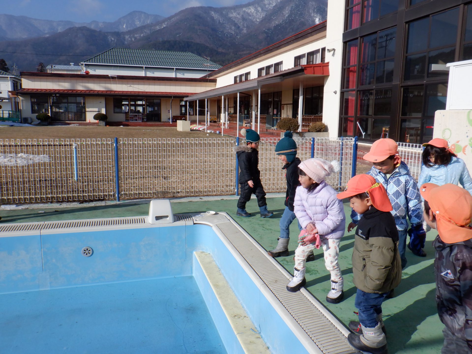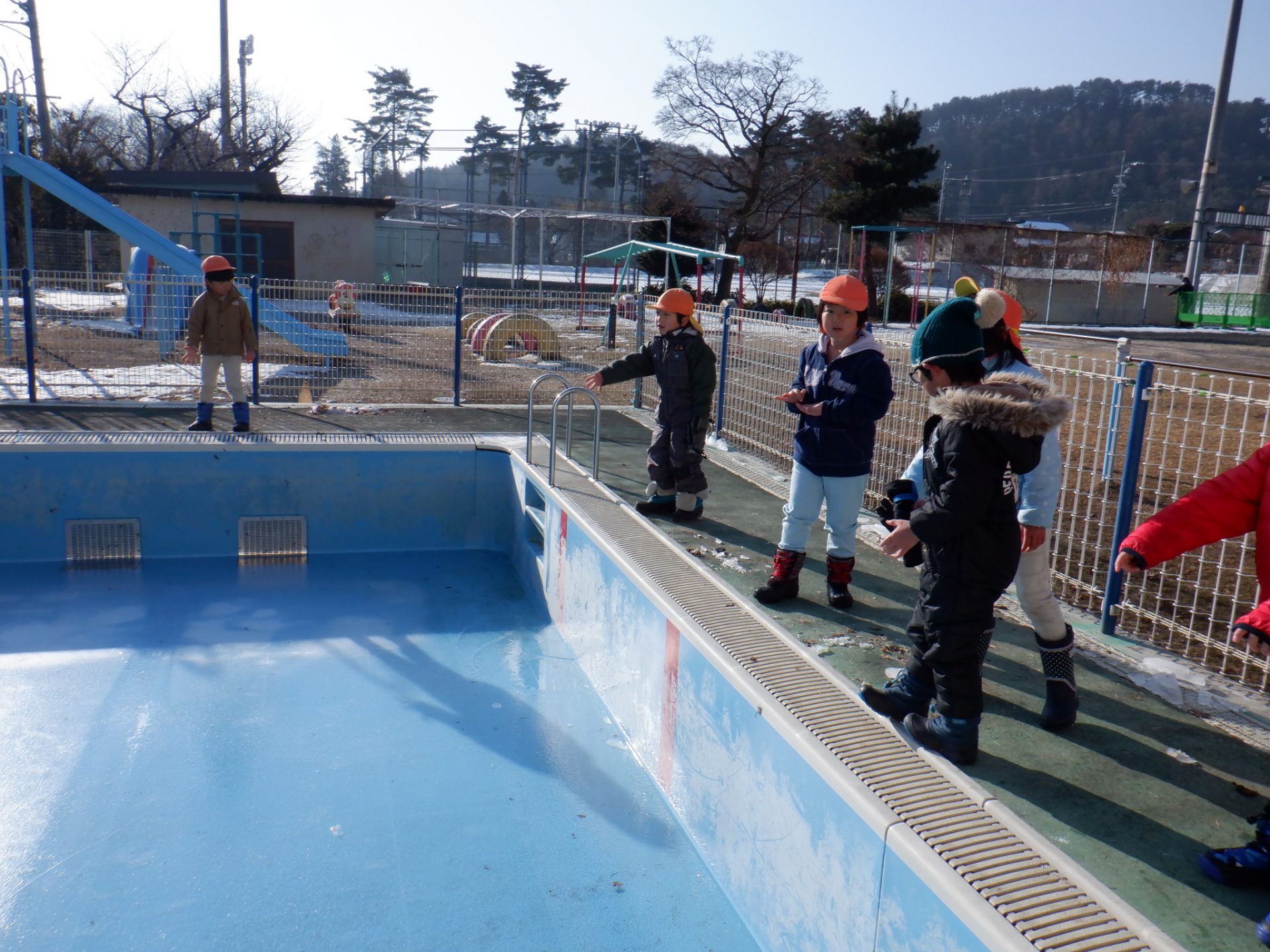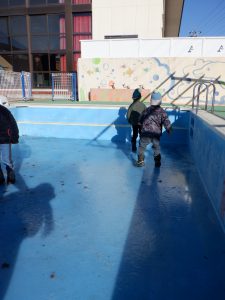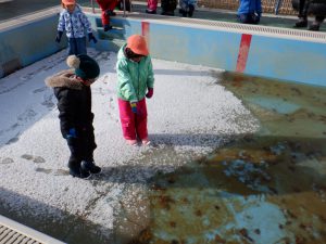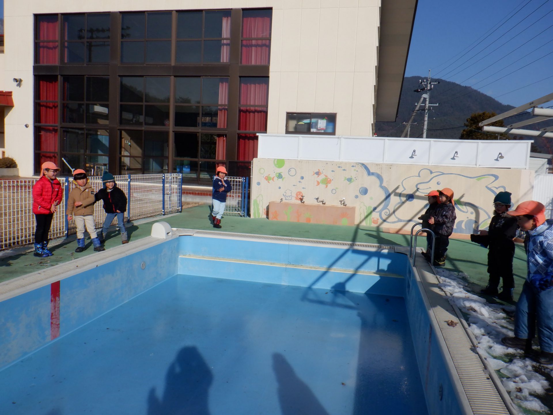 2月のある日のことです。プールの表面には氷が・・でも下は水があり上には乗れないので子ども達と考えて・・・水を抜くことに!