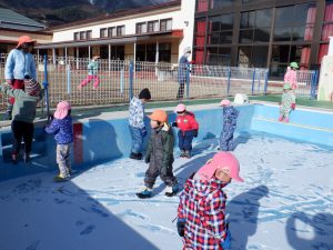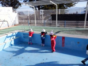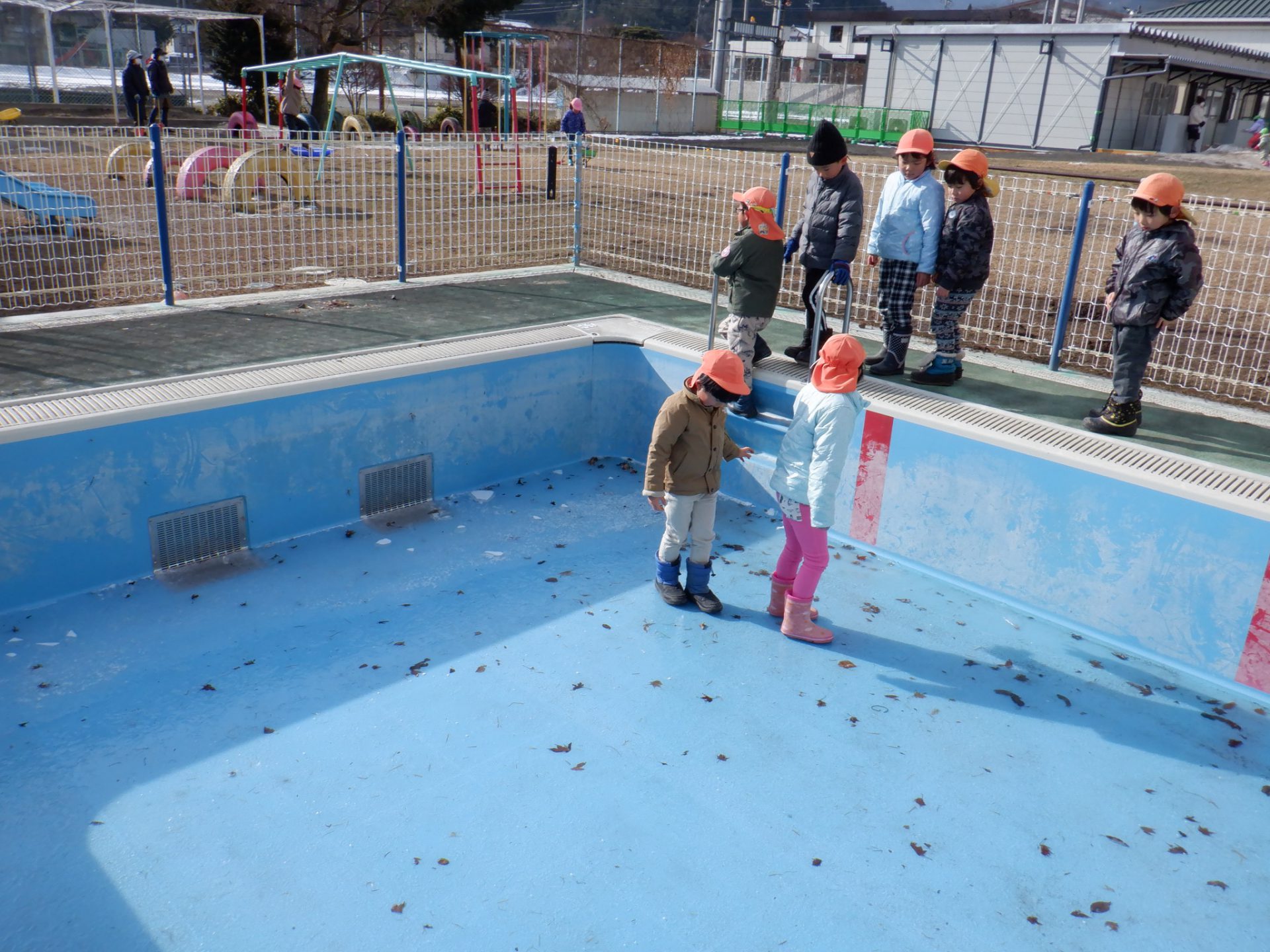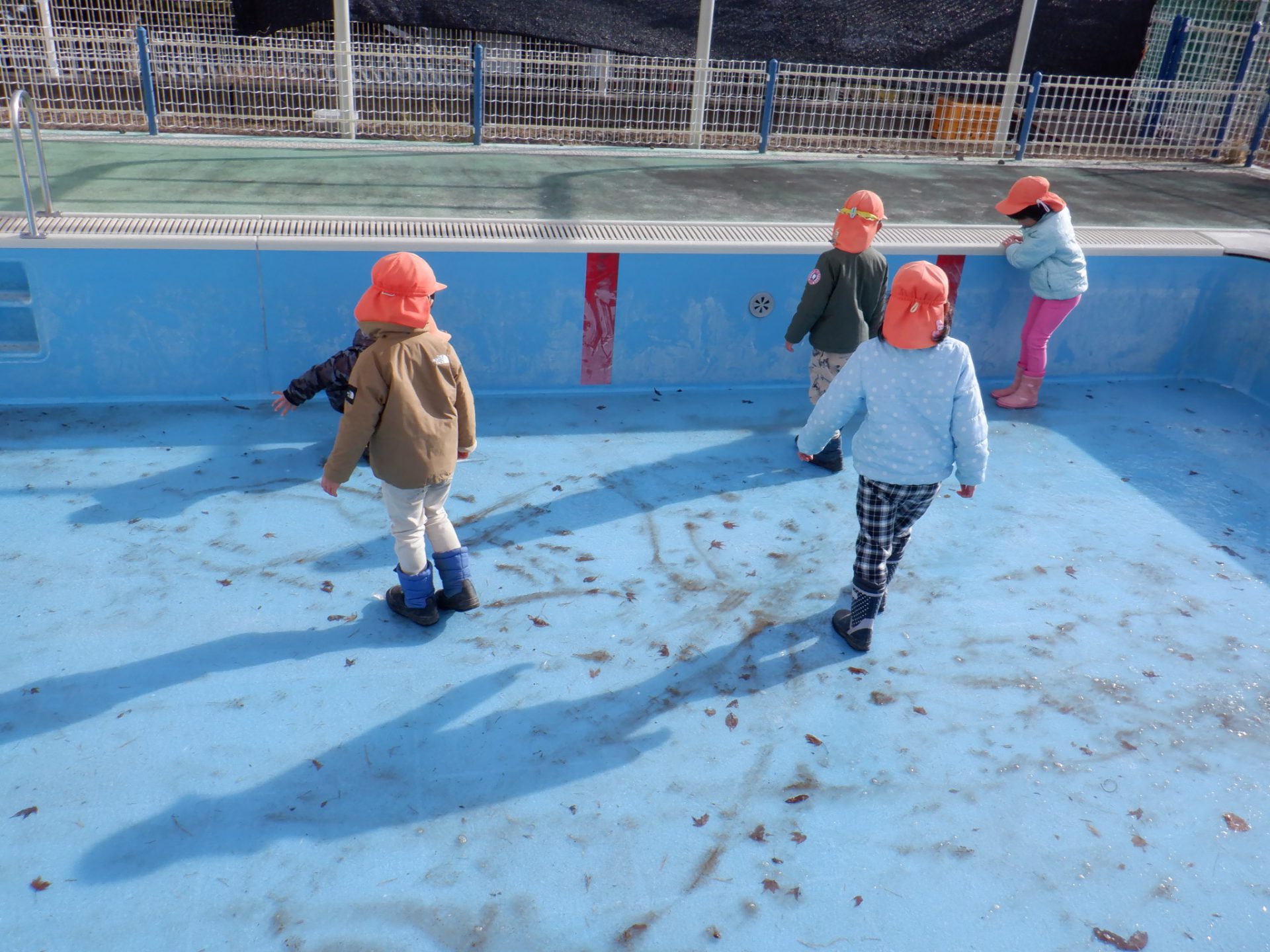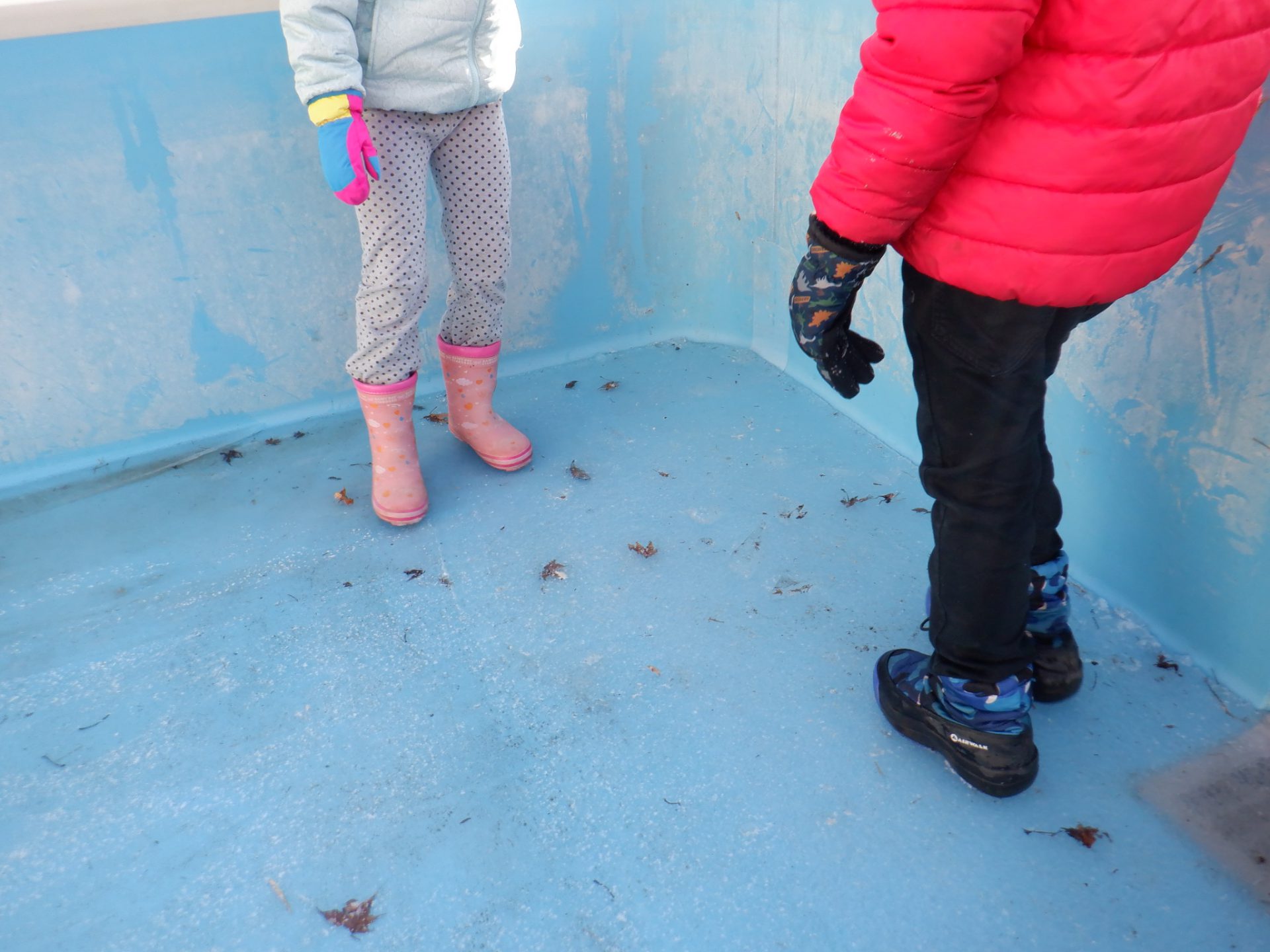 2月のある日のことです。プールの表面には氷が・・でも下は水があり上には乗れないので子ども達と考えて・・・水を抜くことに!