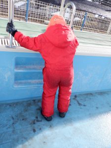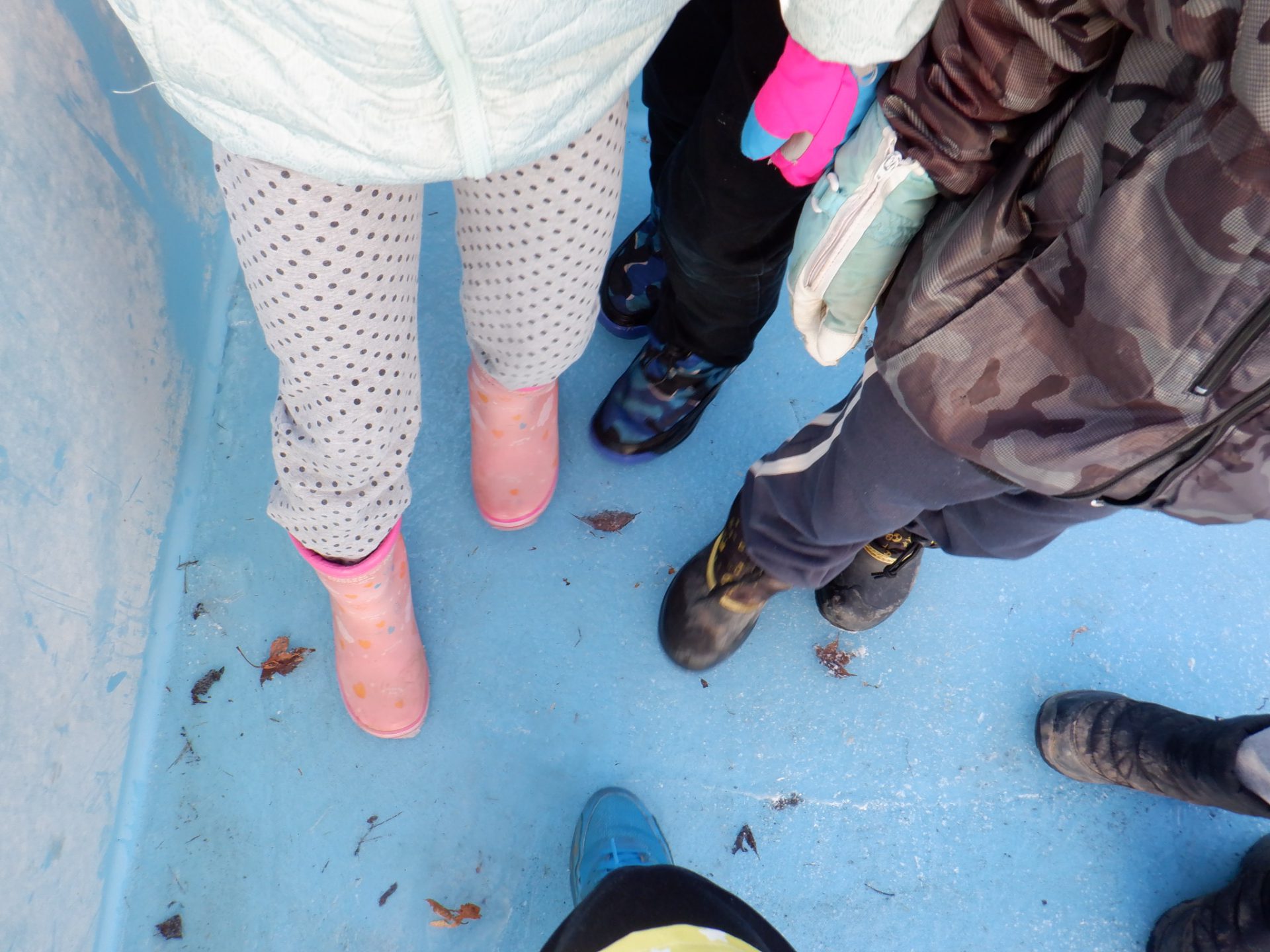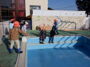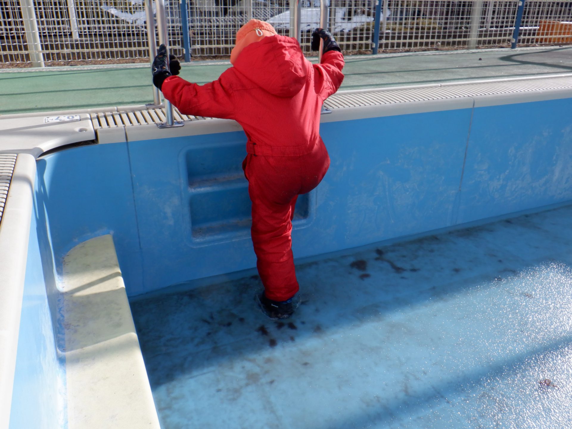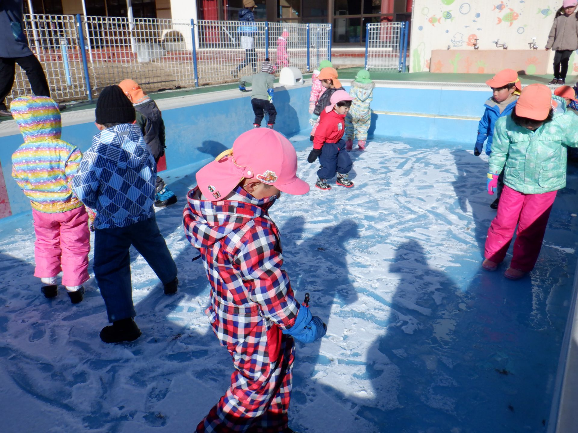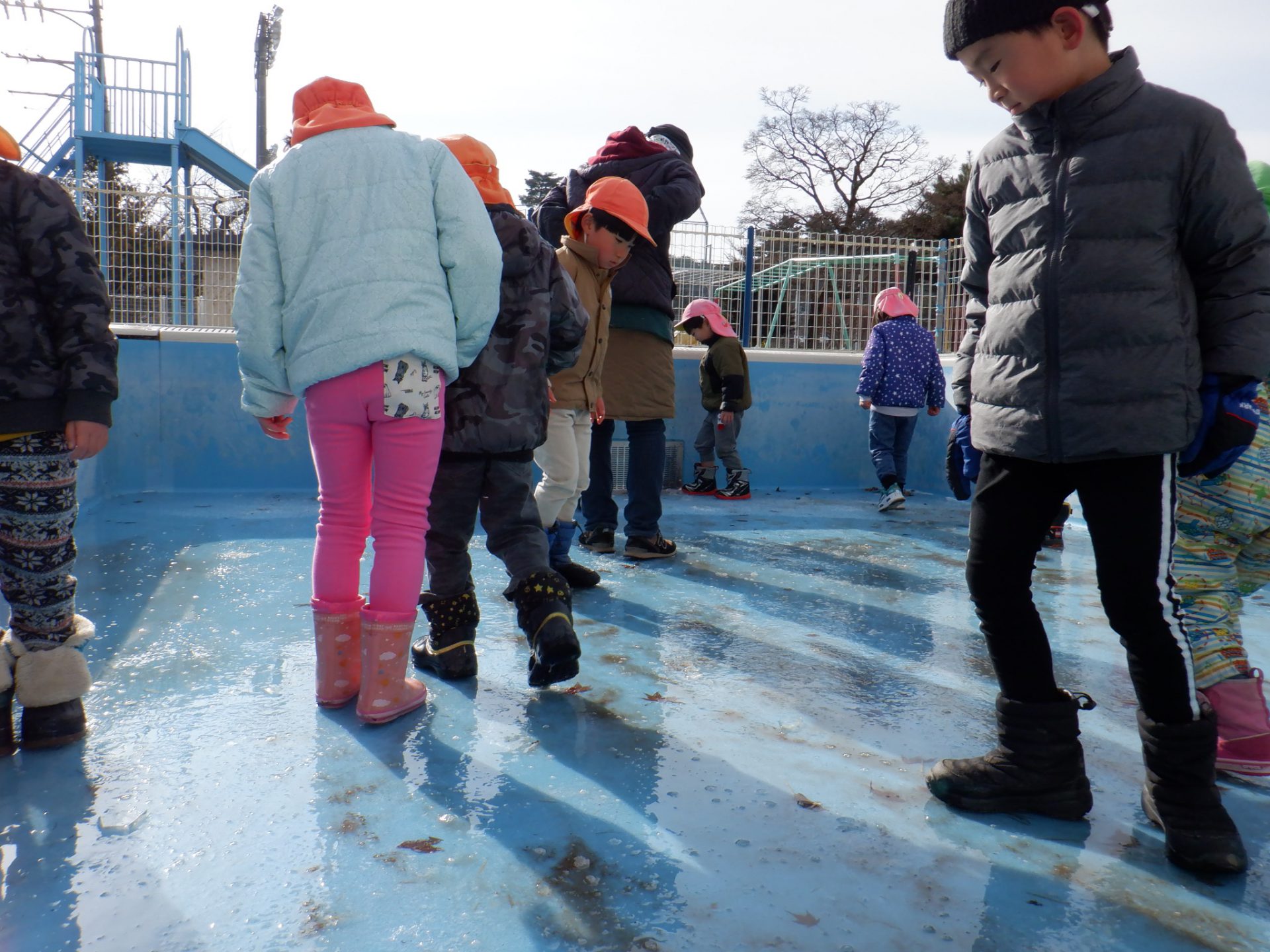2月のある日のことです。プールの表面には氷が・・でも下は水があり上には乗れないので子ども達と考えて・・・水を抜くことに!