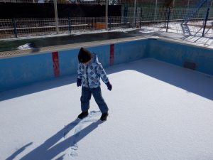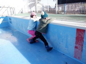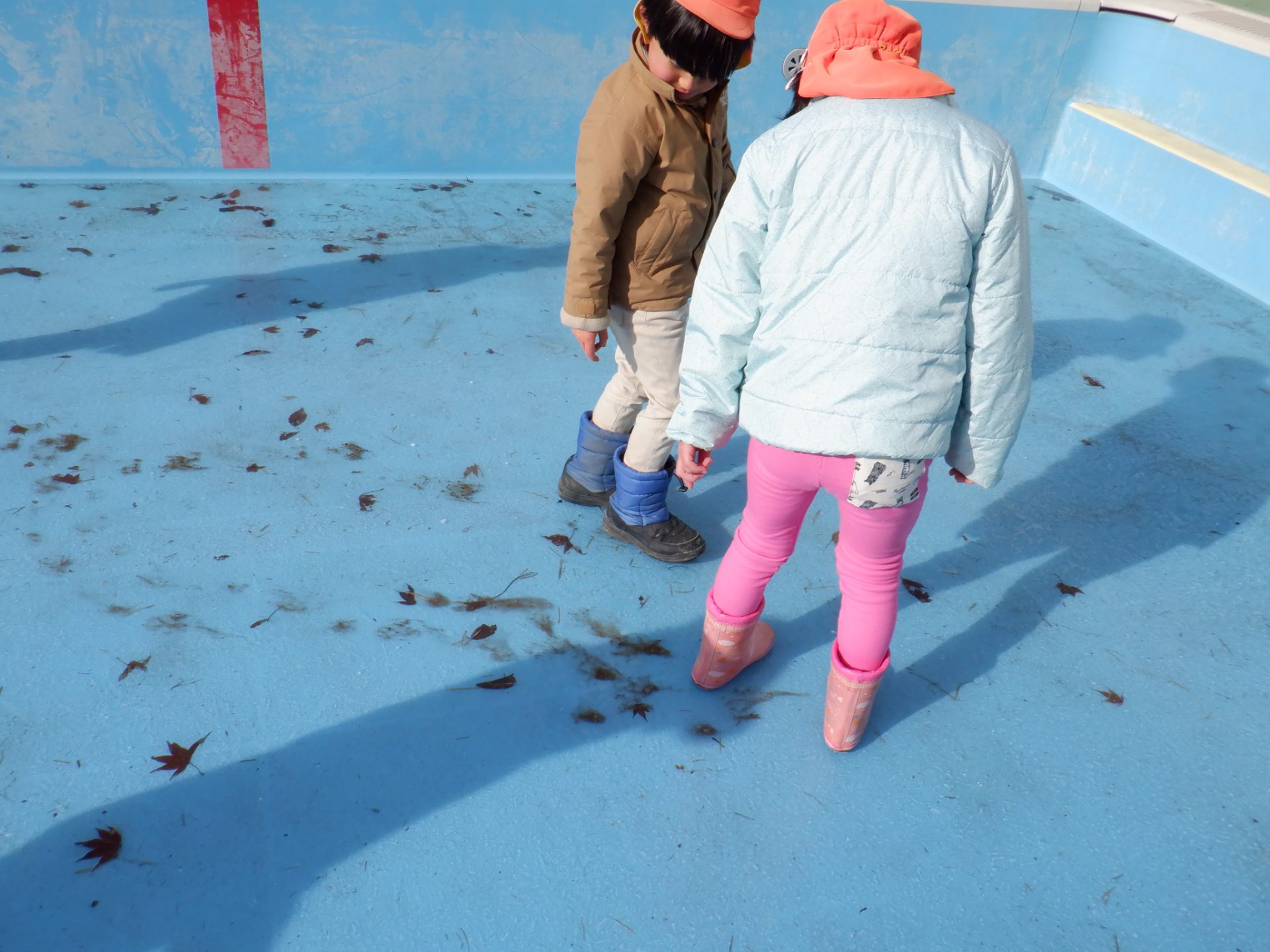 水を全部抜いて→氷もとって→枯れ葉もとって・・・子ども達も「スケート場作ろう」と夢中でそうじをしていました。