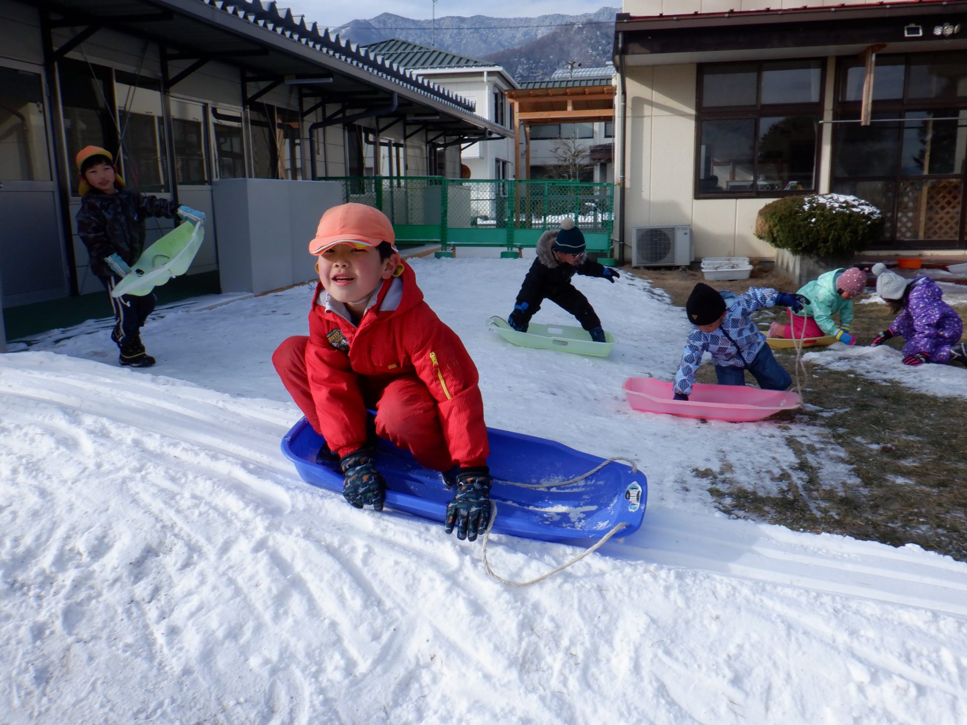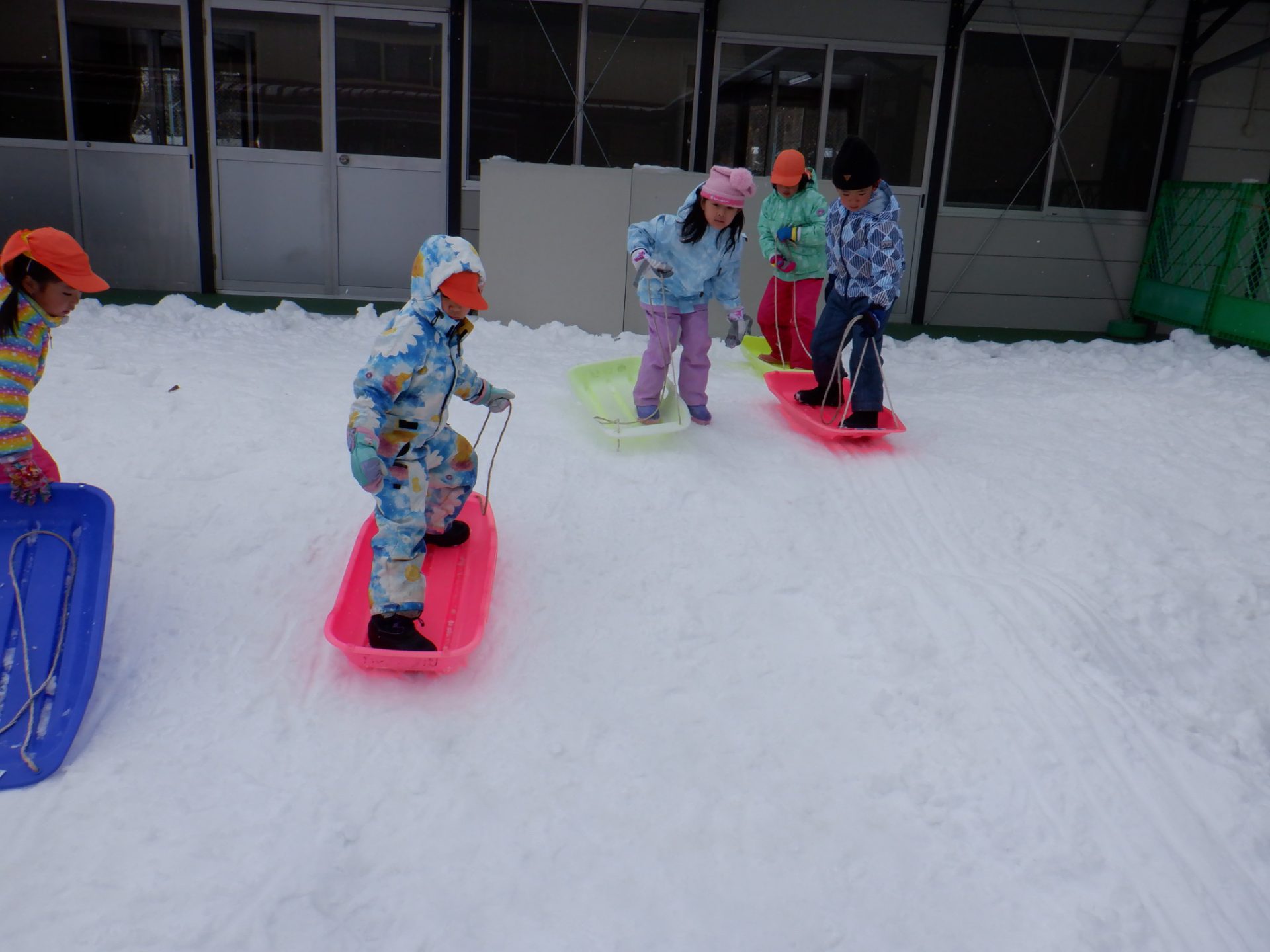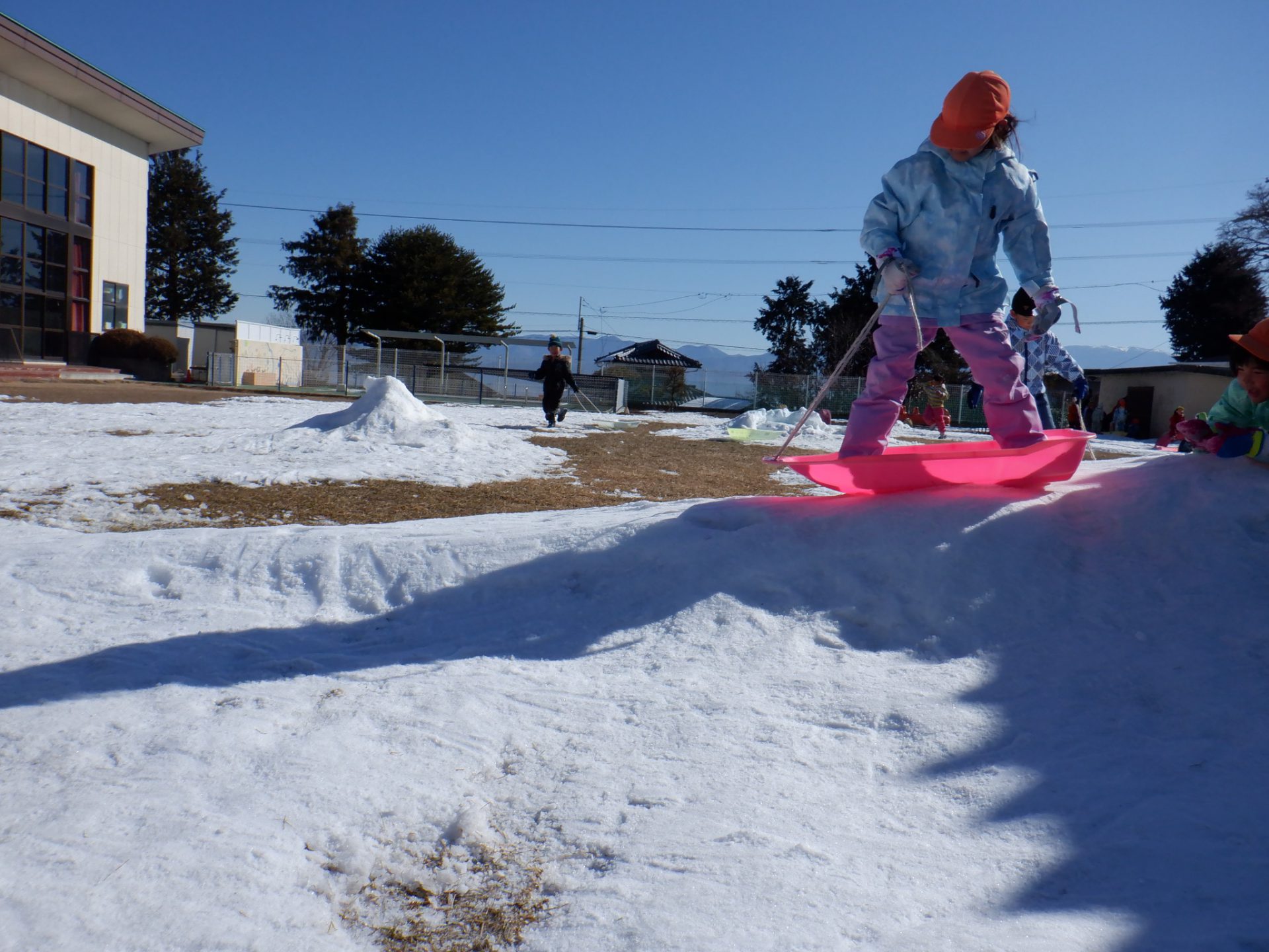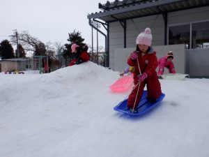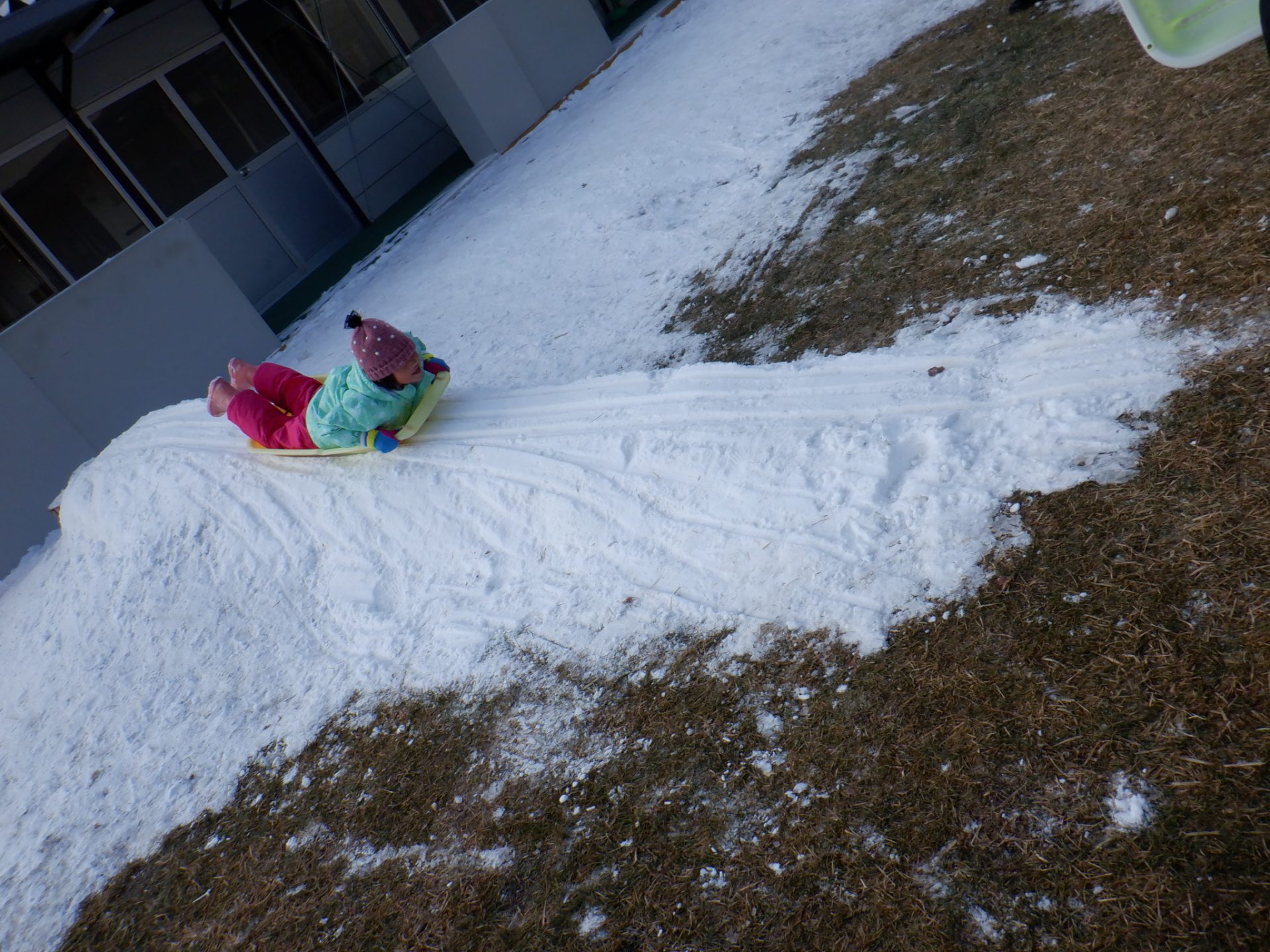 初めてそりに立って滑り始めた時は「危ない」「卒園前にケガしたらどうしよう」と不安でしたが、子どもたちの姿を見ているとちゃんとバランスをとり上手に滑べれていて、体がしっかりしてきていることを感じました。なによりものすごく楽しんでいて、笑い声がたえない日々。「危ない」と止めないで見守ってよかったぁ~と思いました。