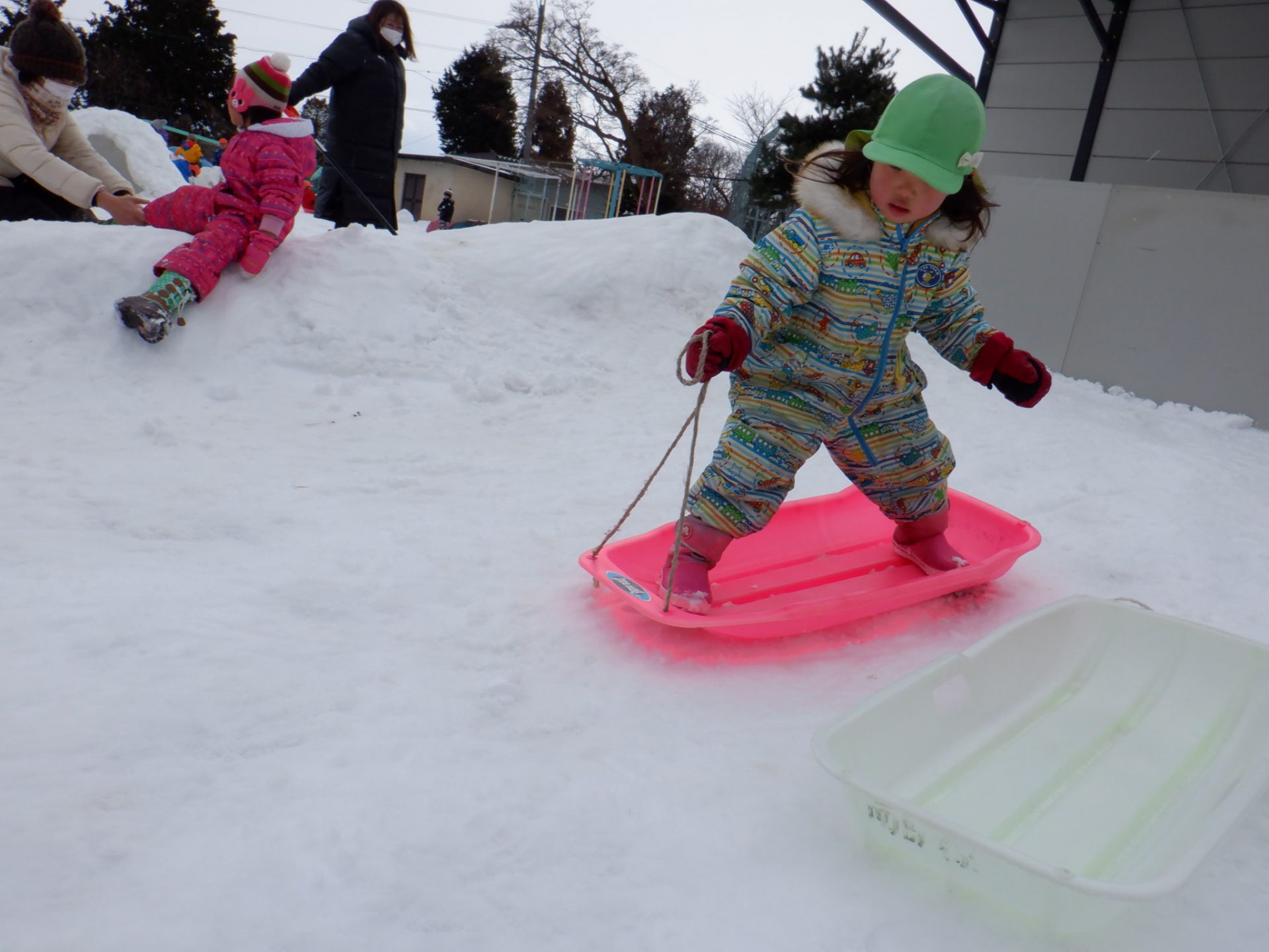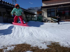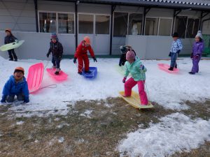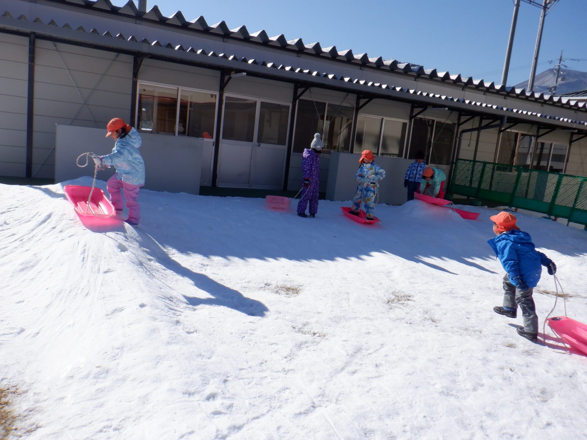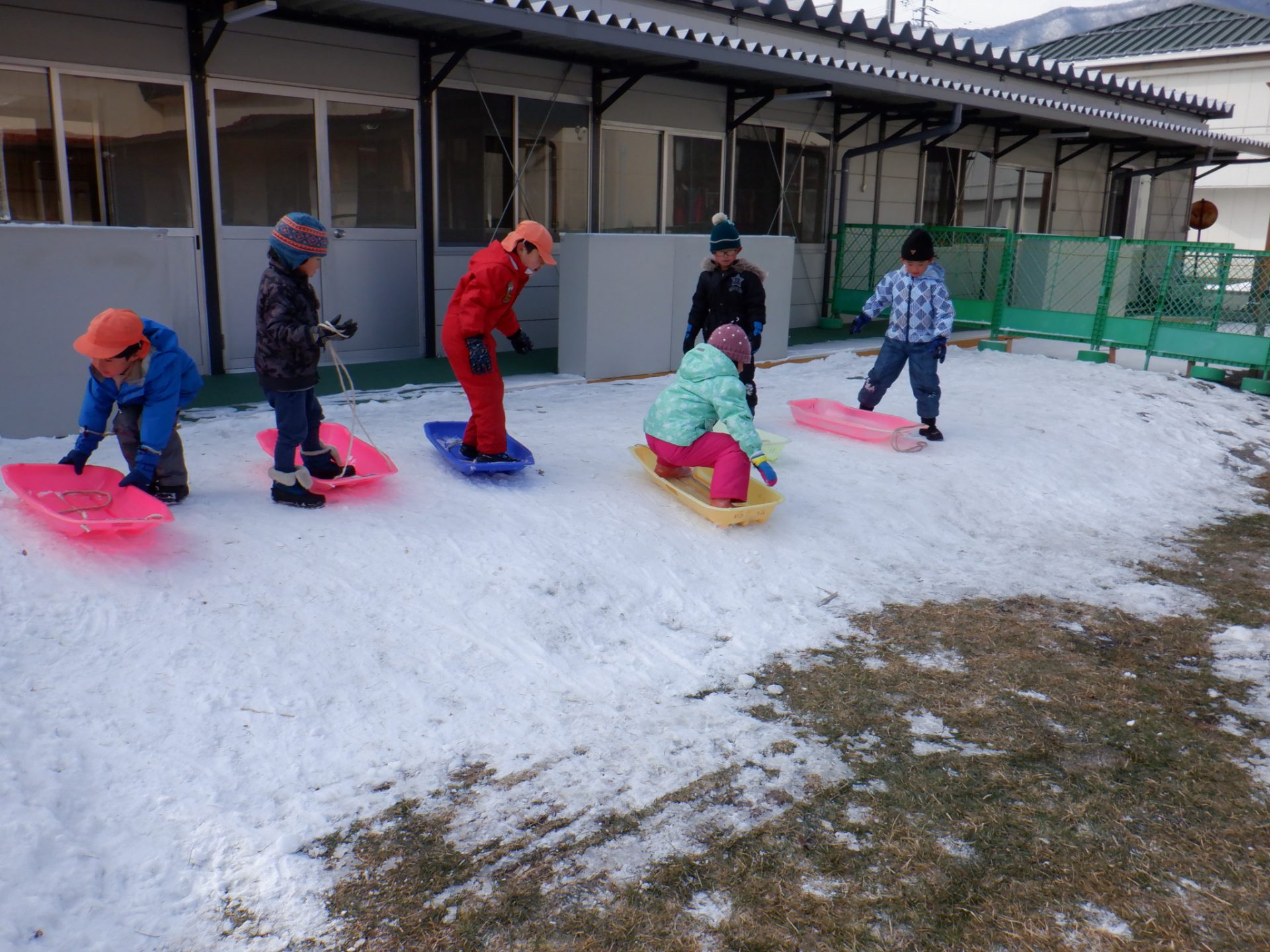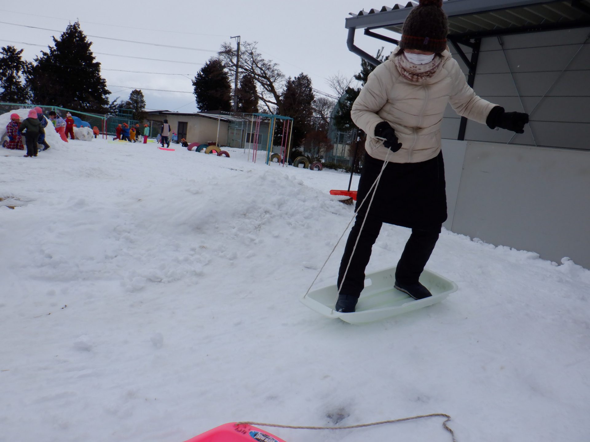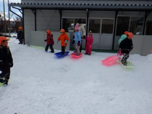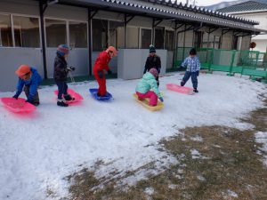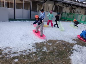 初めてそりに立って滑り始めた時は「危ない」「卒園前にケガしたらどうしよう」と不安でしたが、子どもたちの姿を見ているとちゃんとバランスをとり上手に滑べれていて、体がしっかりしてきていることを感じました。なによりものすごく楽しんでいて、笑い声がたえない日々。「危ない」と止めないで見守ってよかったぁ~と思いました。