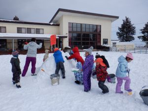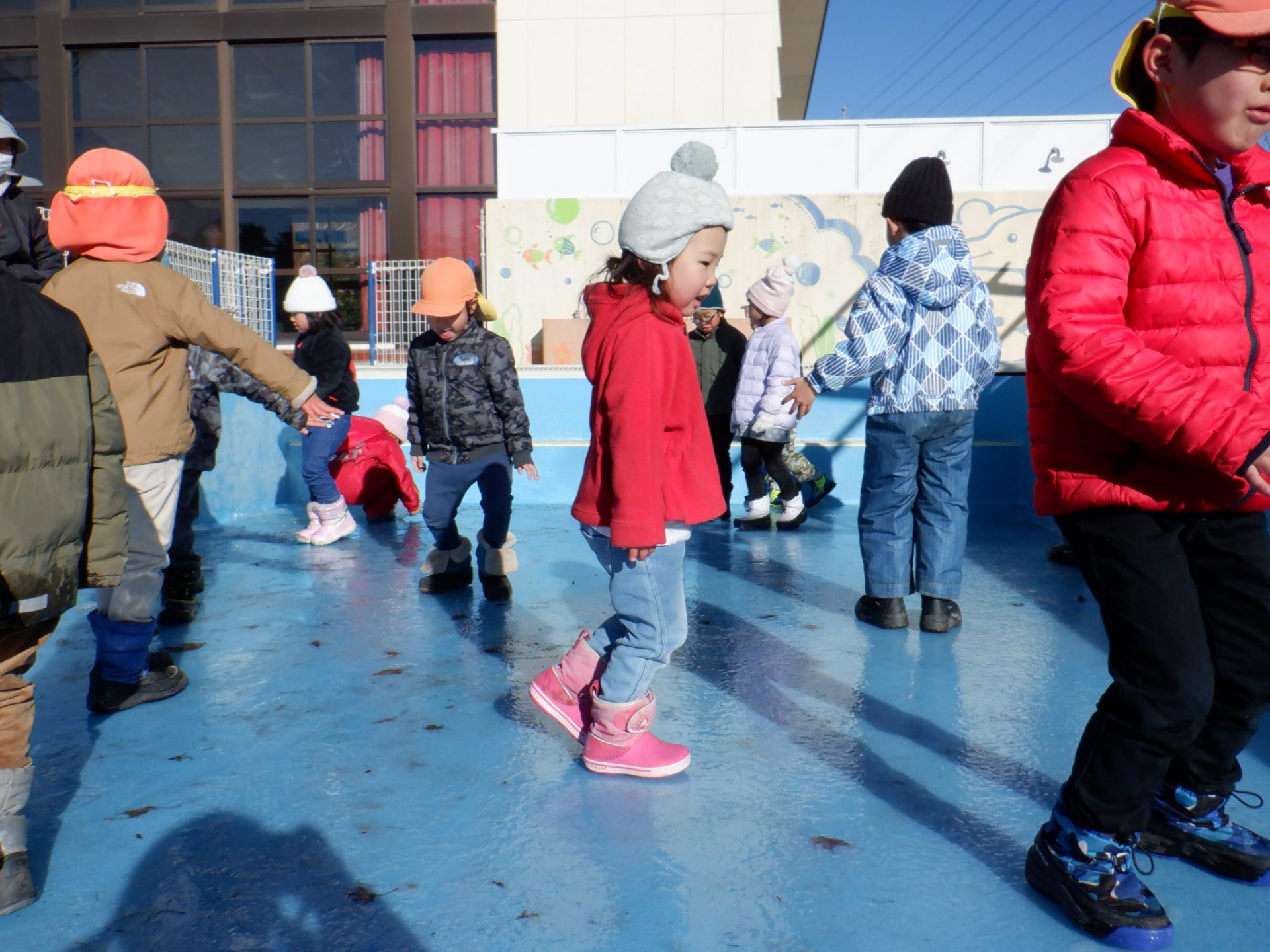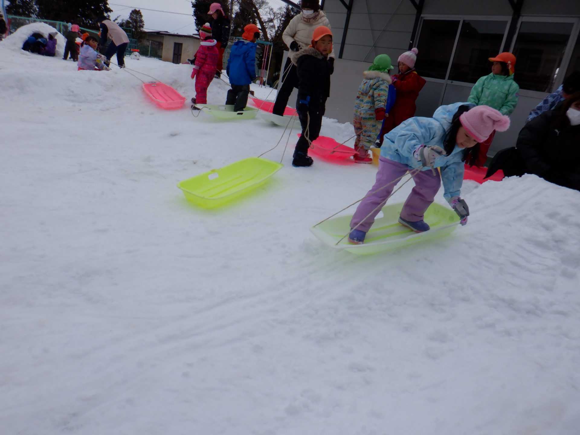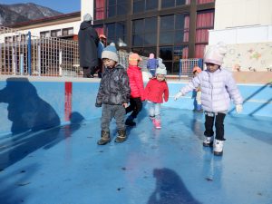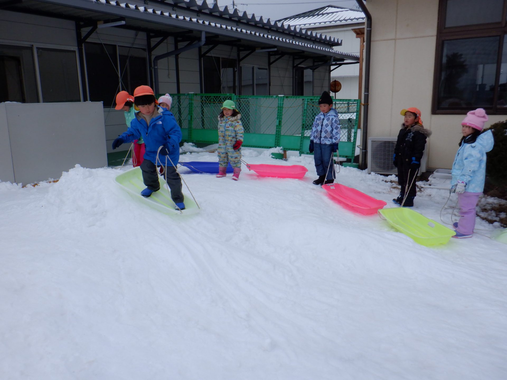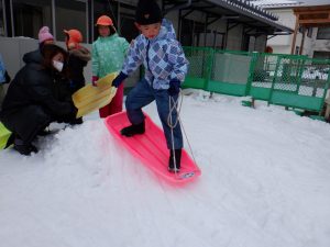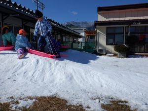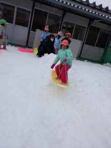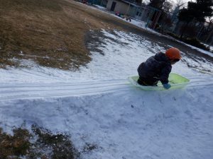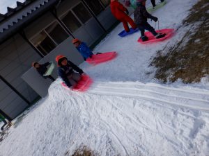 初めてそりに立って滑り始めた時は「危ない」「卒園前にケガしたらどうしよう」と不安でしたが、子どもたちの姿を見ているとちゃんとバランスをとり上手に滑べれていて、体がしっかりしてきていることを感じました。なによりものすごく楽しんでいて、笑い声がたえない日々。「危ない」と止めないで見守ってよかったぁ~と思いました。