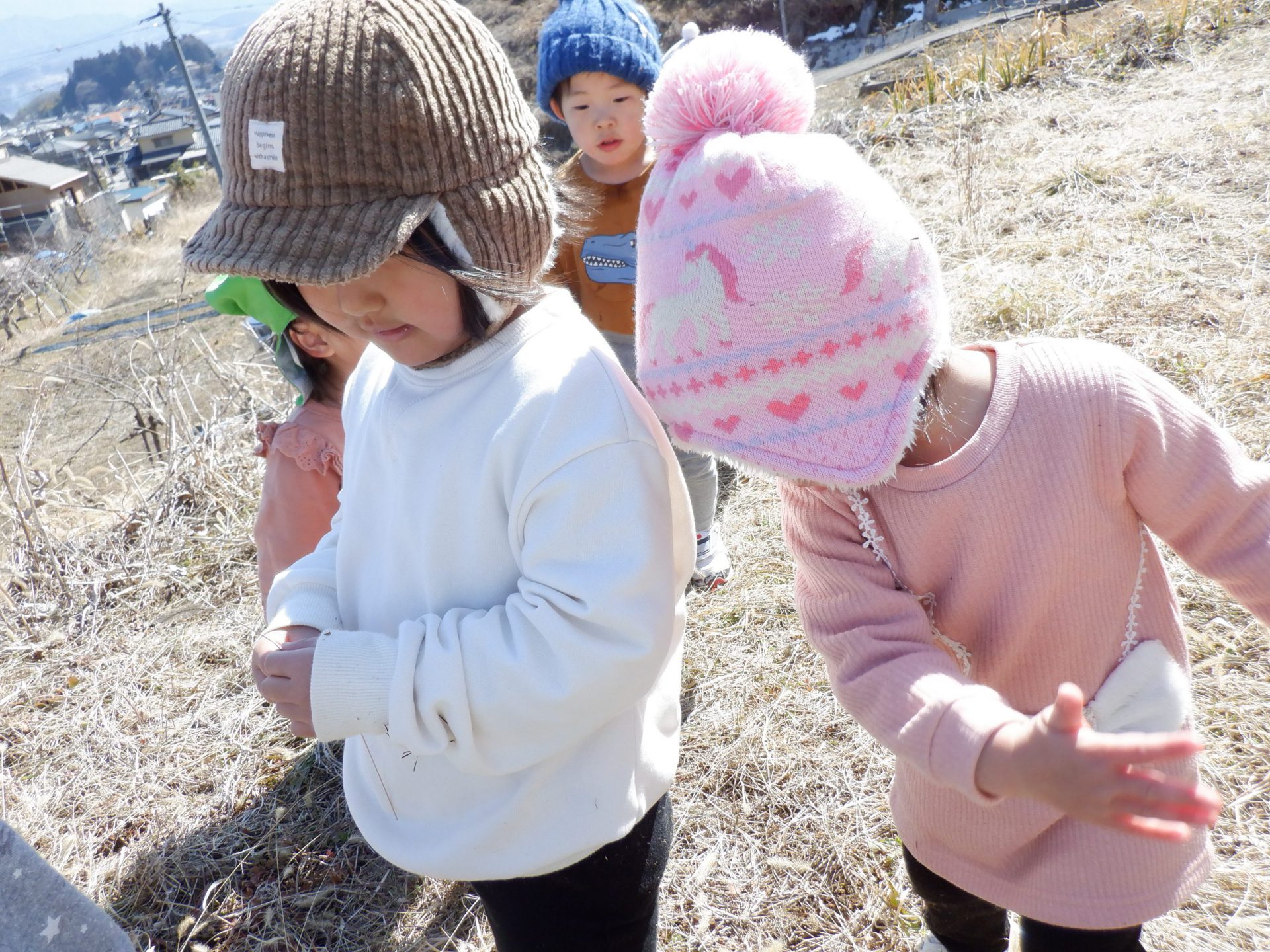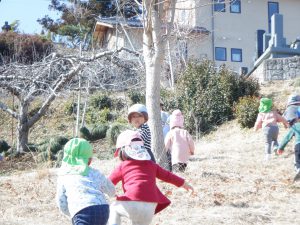 天気が良く、この日はお散歩日和!みんなで仲良く手を繋いでリンゴ坂へお出かけしました。“リンゴ坂”とは、リンゴ畑の間を縫っていく小道のことで、中高生や地域の方がよく利用されています。急坂ながらも車が通らないのどかな道で、その脇にある大きな土手は大好きな遊び場です。