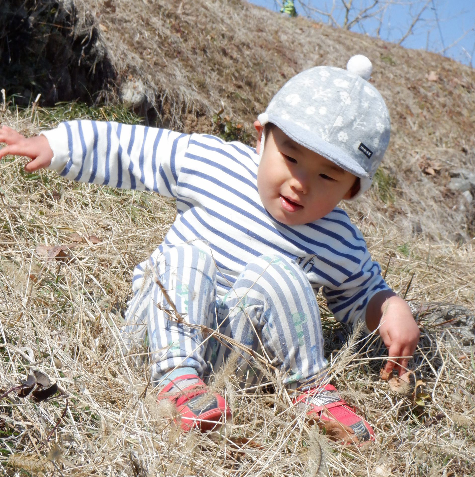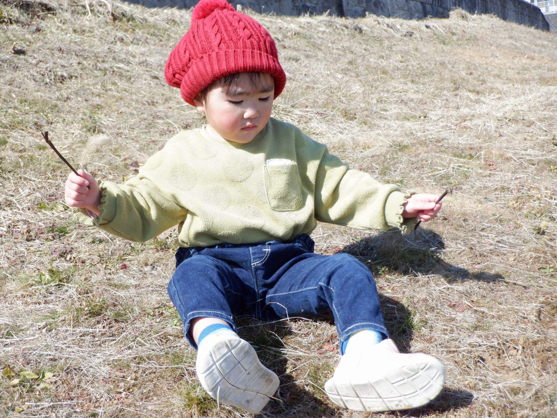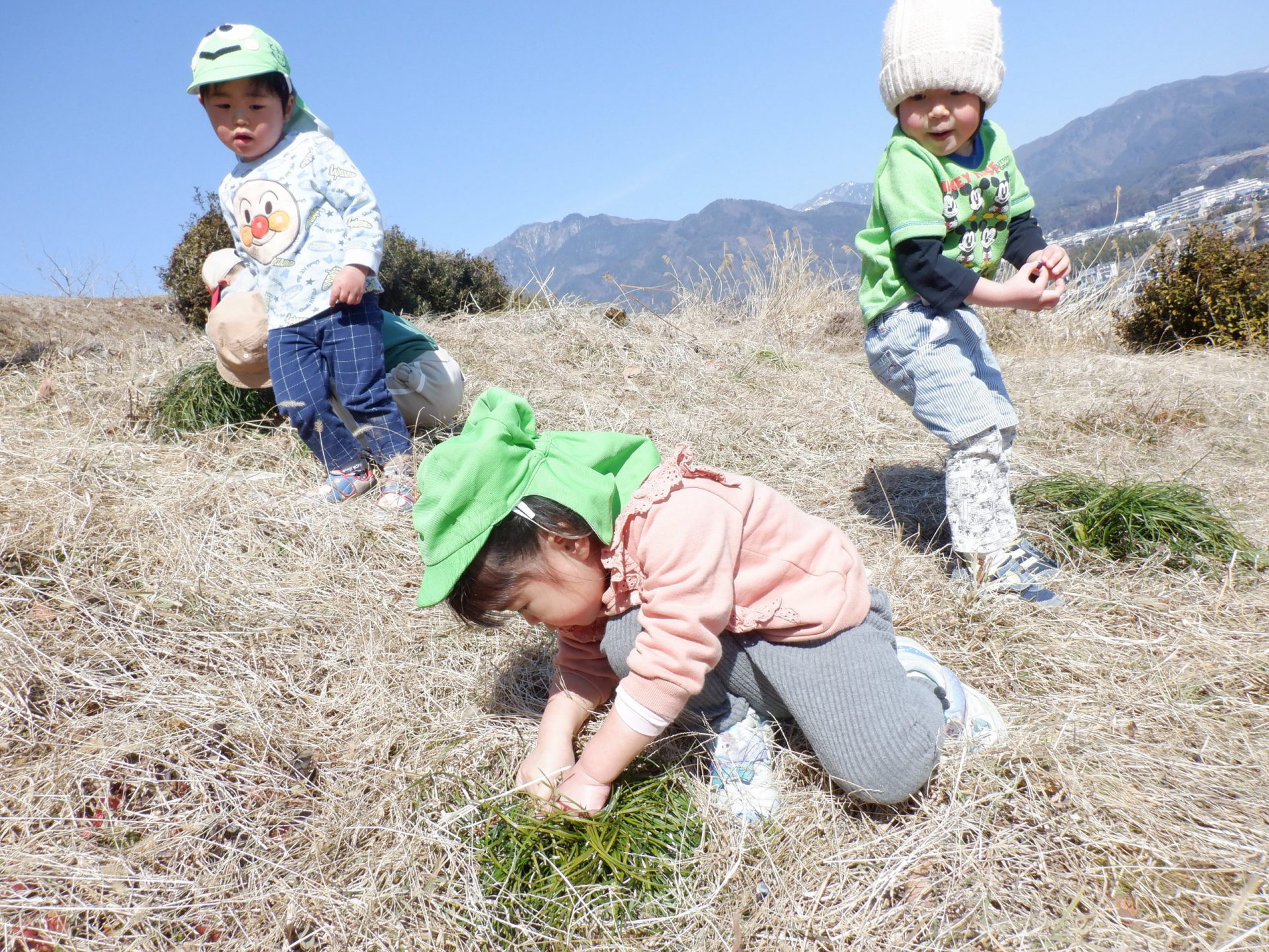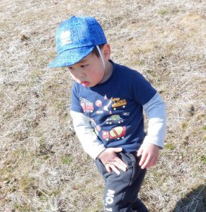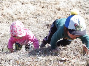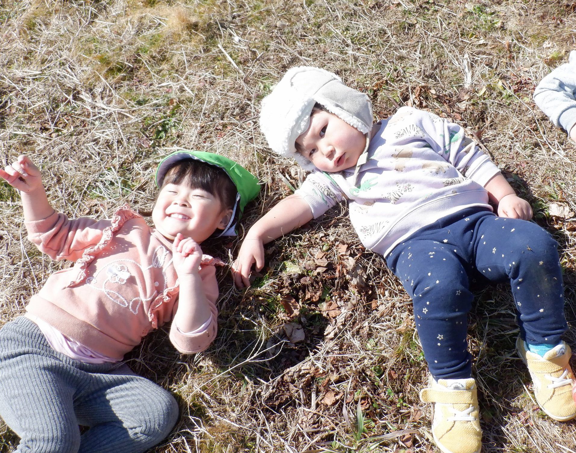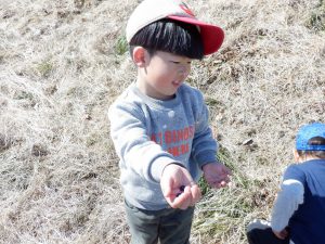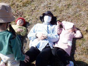 「気持ちがいいね~」と保育士が横になると、真似してみんなもごろん♪地面の柔らかさと日の暖かさが全身に伝わってきて本当に心地よかったです。おかげで背中まで草まみれになりましたが、お友だち同士で背中を叩きあって「ゴミとれたよ!」「あんがと」と可愛いやり取りも見られました。