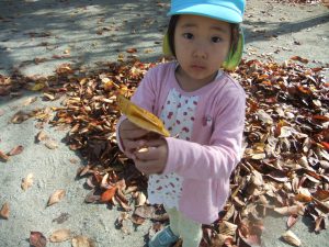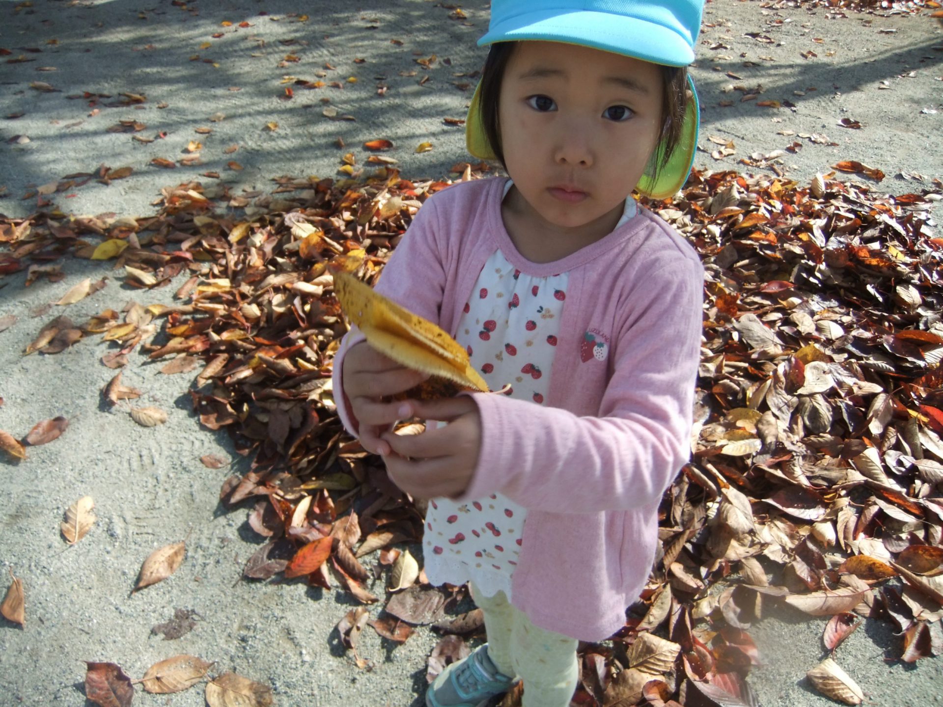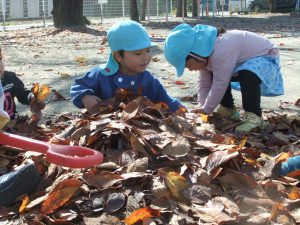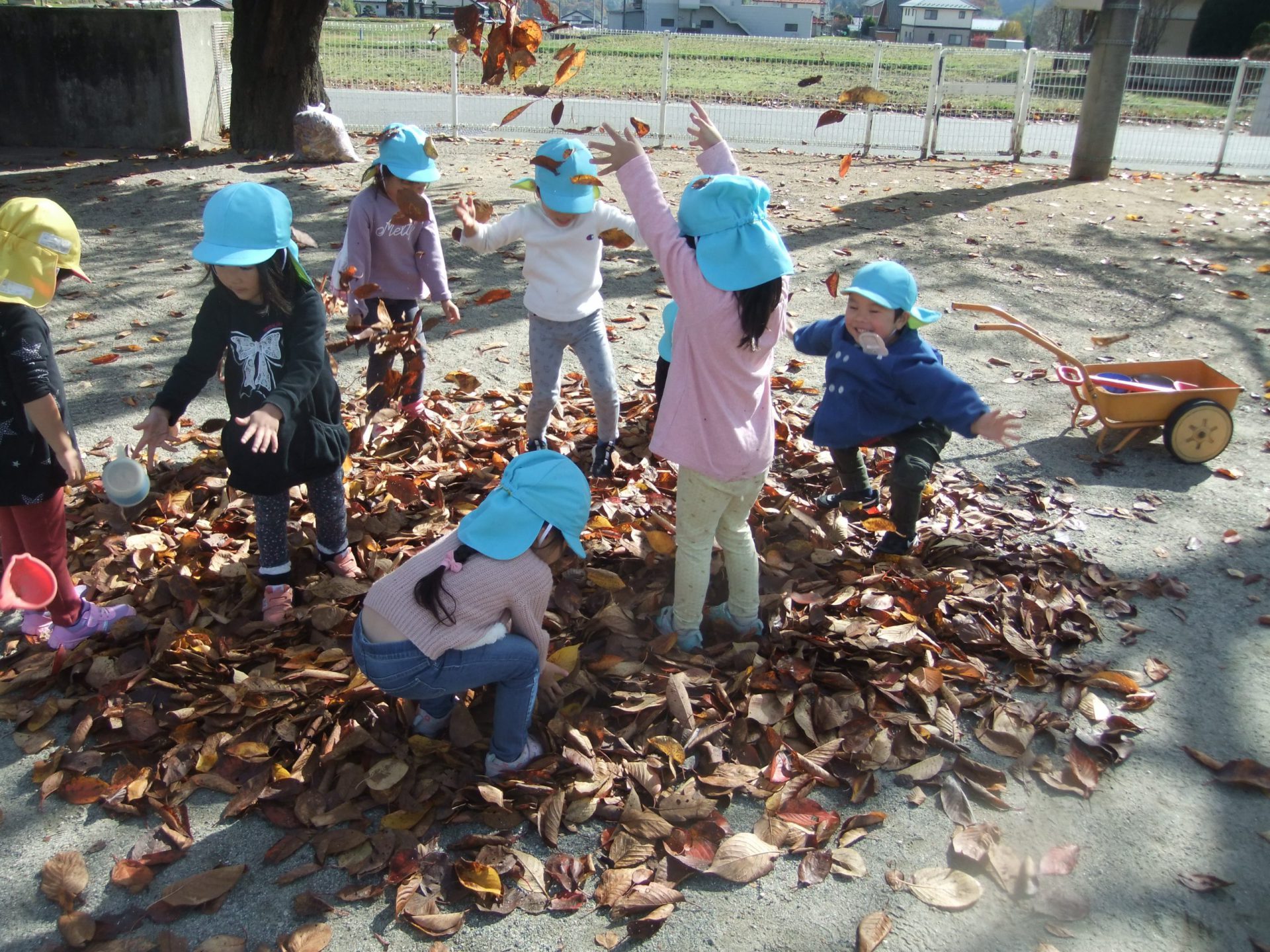 園庭の木々から落ちてくる葉っぱを集め、秋の自然に触れる。