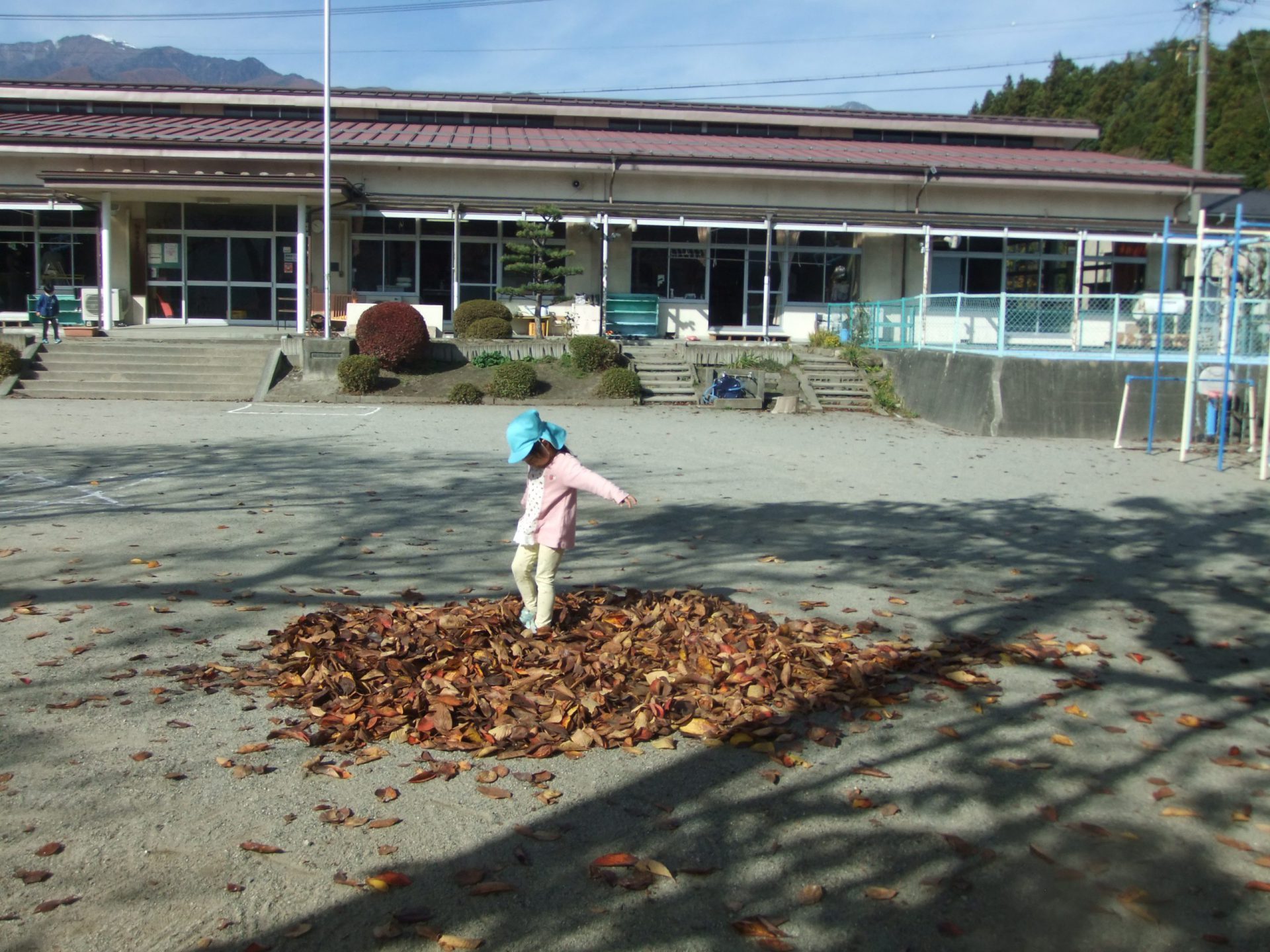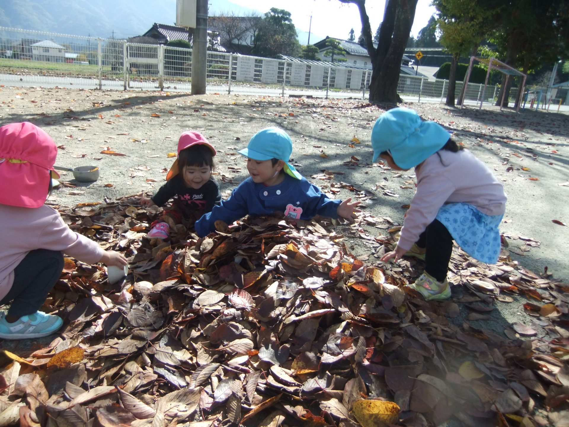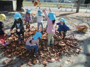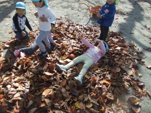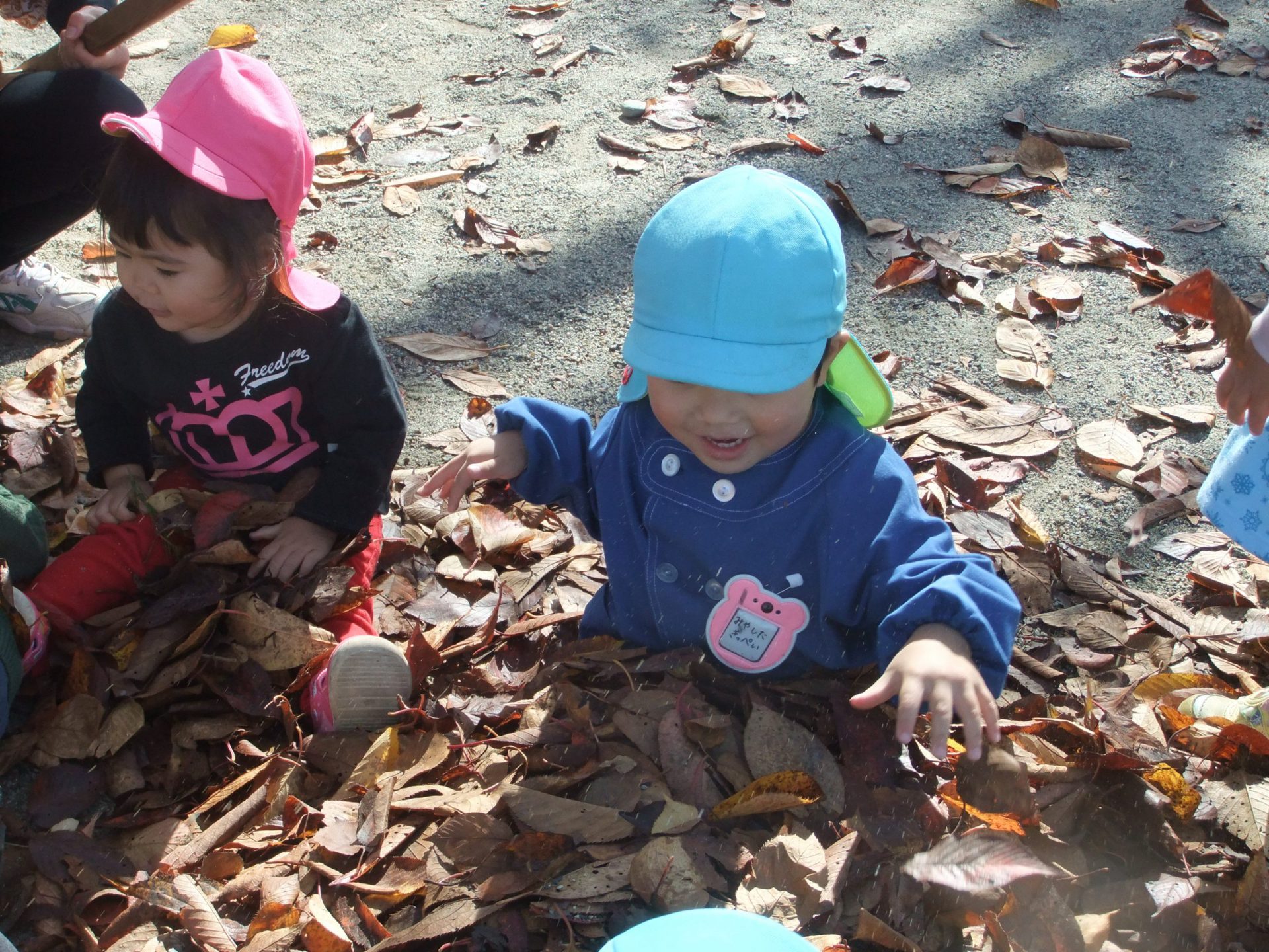 数日前から木の葉っぱが落ちていることに気付き「葉っぱが落ちてきてる~」や「風でとんでく~!」などと言っていた。保育者が葉っぱをはきながら集めていると1名の子が興味を持ち、集めた葉っぱの中に座り込んだり寝転がり「気持ちいいね。」「あったかい!楽しい!」と葉っぱの感触に気付いていた。周りの子もだんだんと集まり葉っぱに触れることを楽しんでいた。その中の1人が「たくさんかけて!」と言い葉っぱをかけてもらうと「毛布みたい~」と身近なものにたとえ、遊びへとつながり自然物で遊ぶことの楽しさに気付いていた。