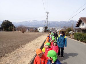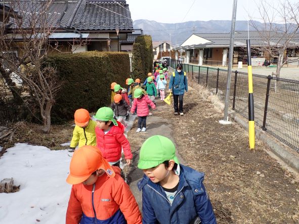 年長組が卒園式の練習だったので、年少組と年中組で“お別れ散歩”です。