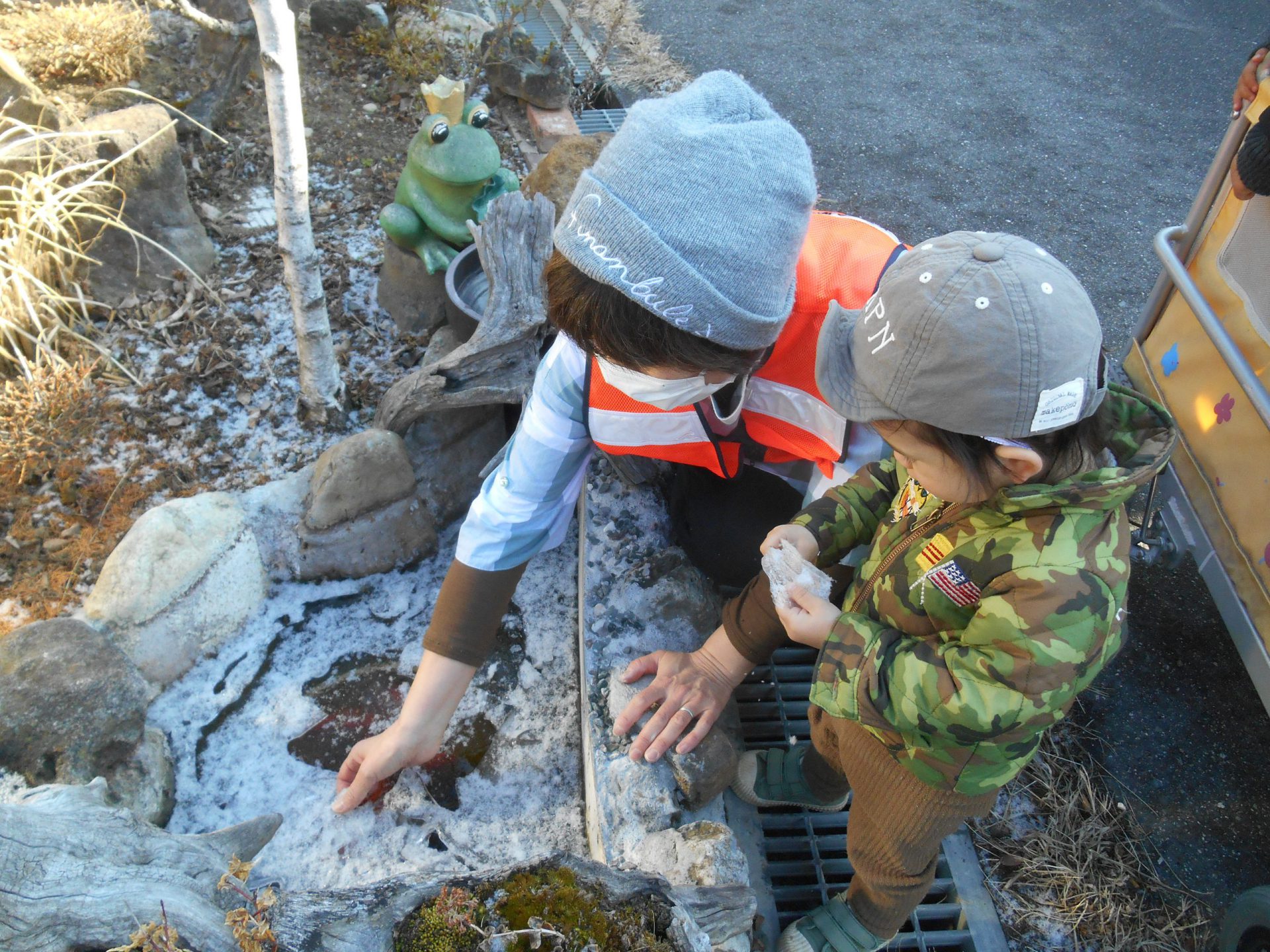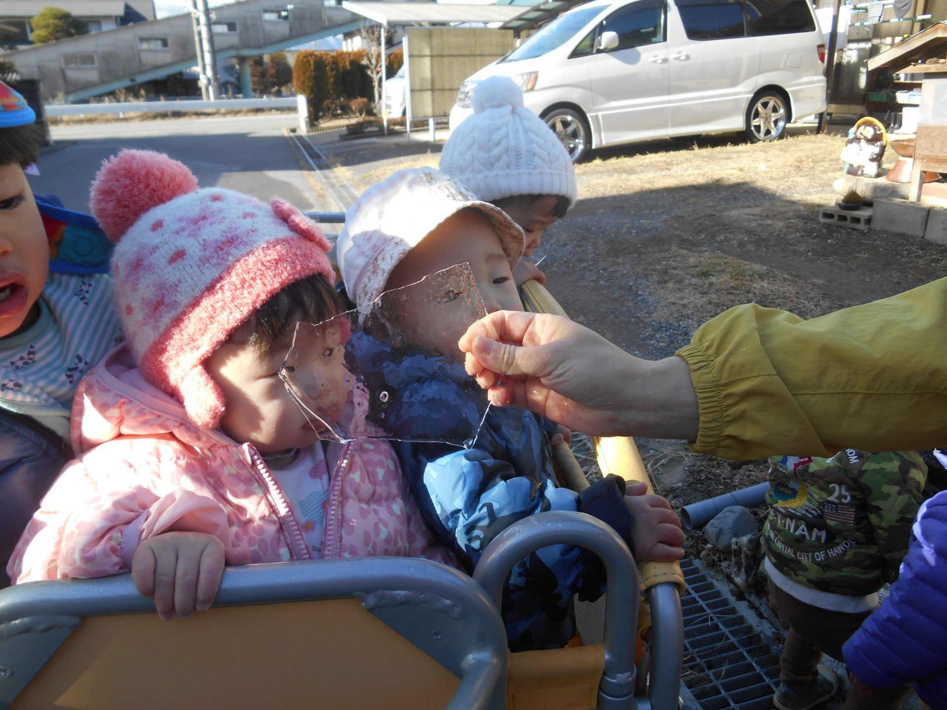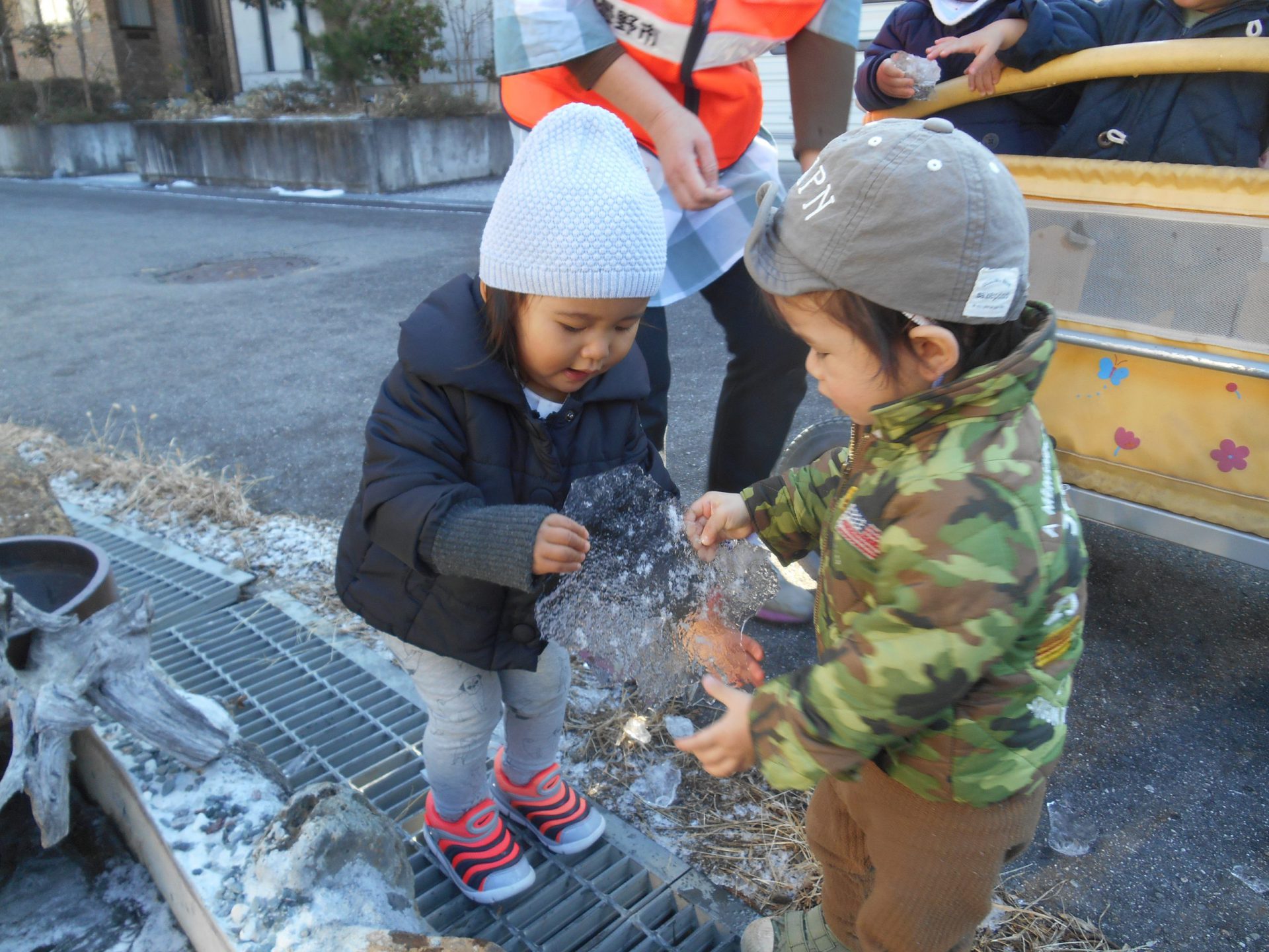 いつもの散歩コースで、氷を発見したことにより、「お魚さんの所へ行きたい。」とまた一つ楽しみができました。ひとつひとつの経験が子ども達の実になり、自然の中でいろいろ気づける子ども達になってくれたらいいなと思います。