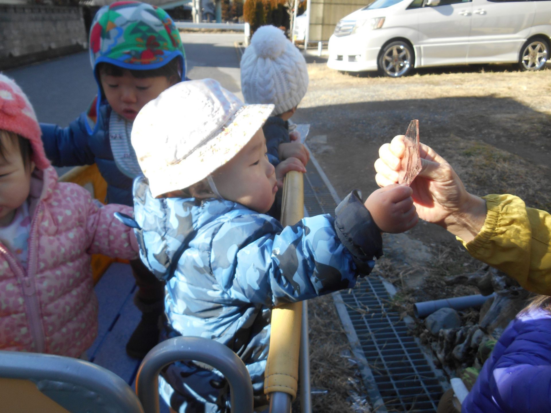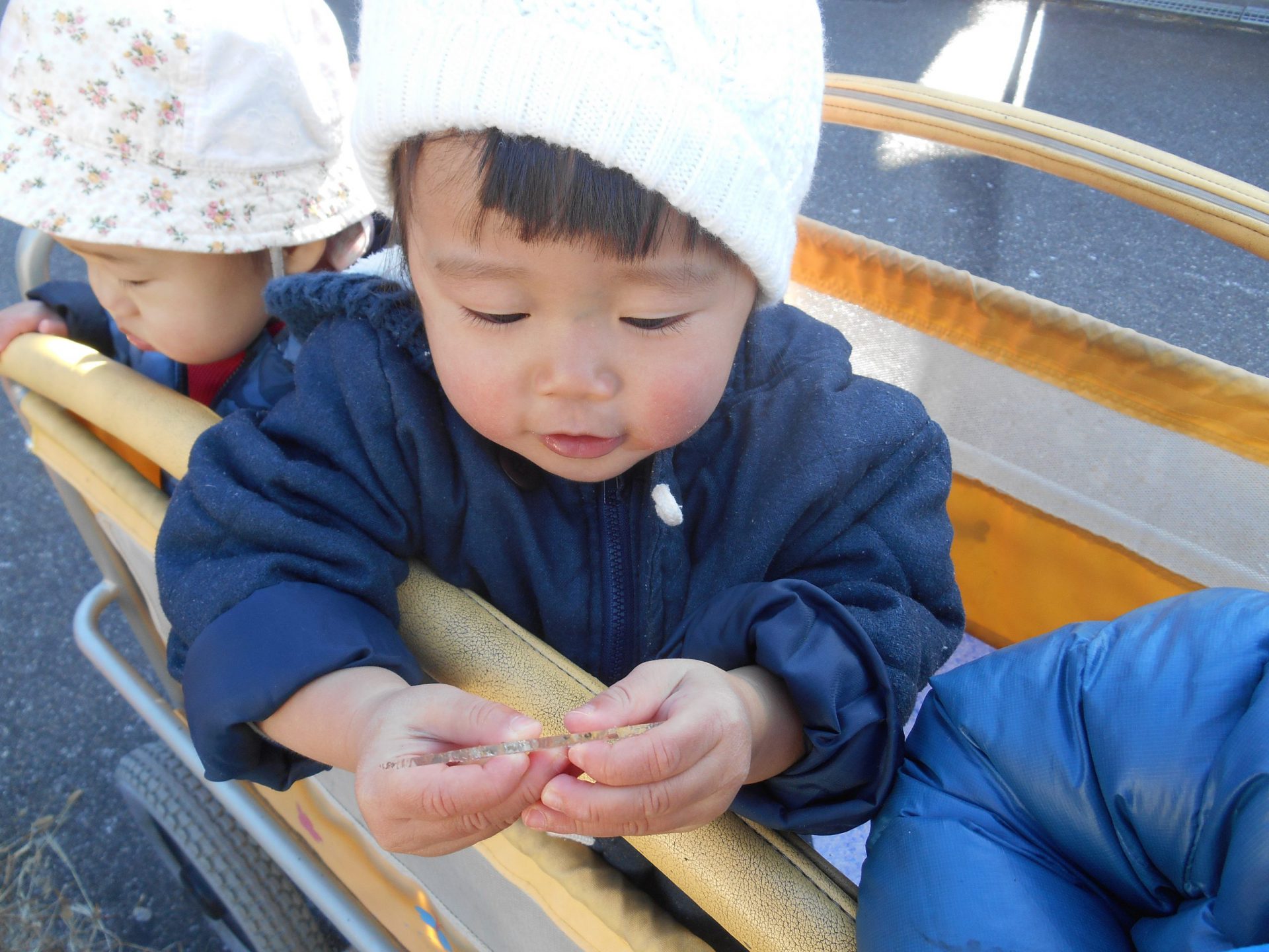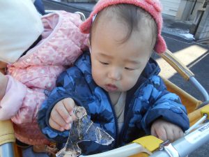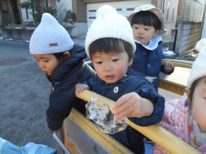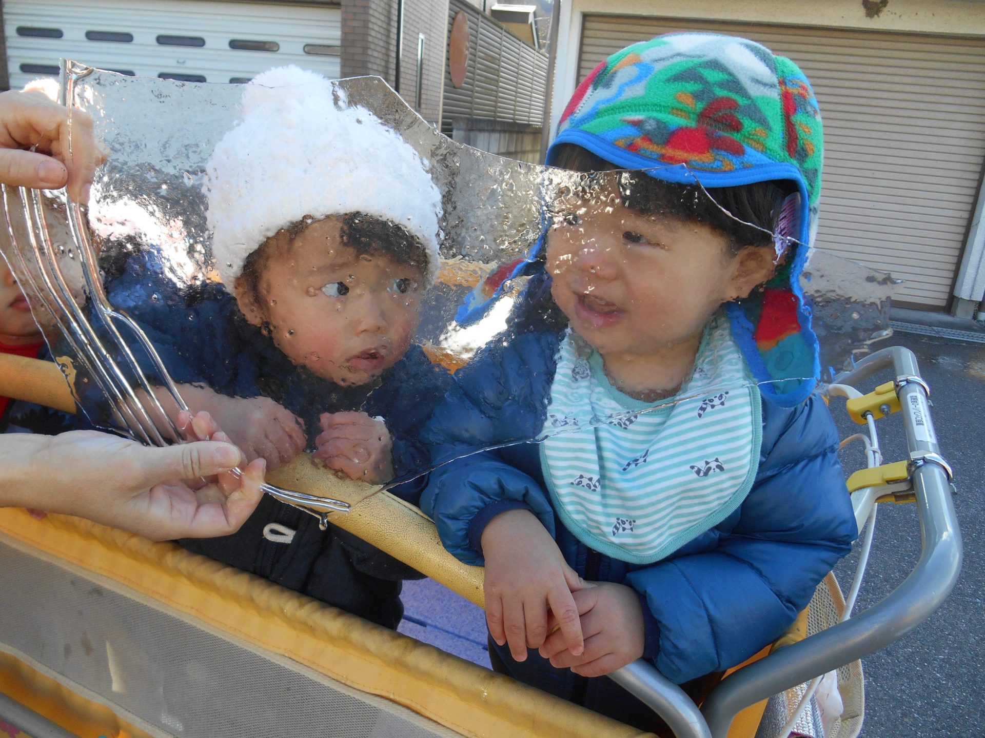 いつもの散歩コースで、氷を発見したことにより、「お魚さんの所へ行きたい。」とまた一つ楽しみができました。ひとつひとつの経験が子ども達の実になり、自然の中でいろいろ気づける子ども達になってくれたらいいなと思います。