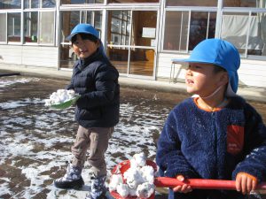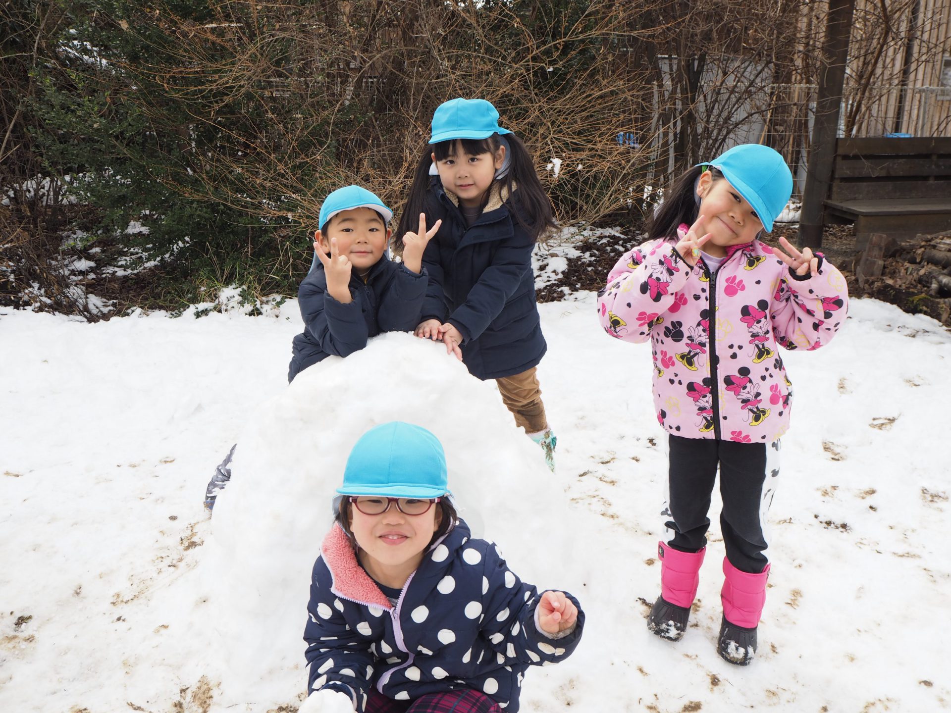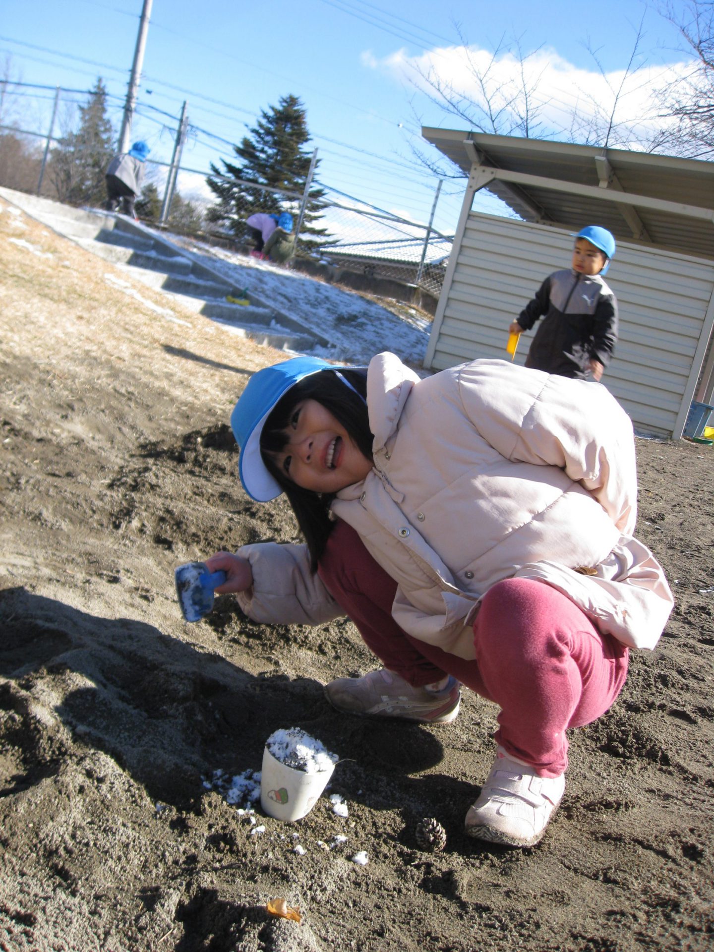 テラスや園庭の隅に積もった雪でおままごとをしたりして楽しみました❄