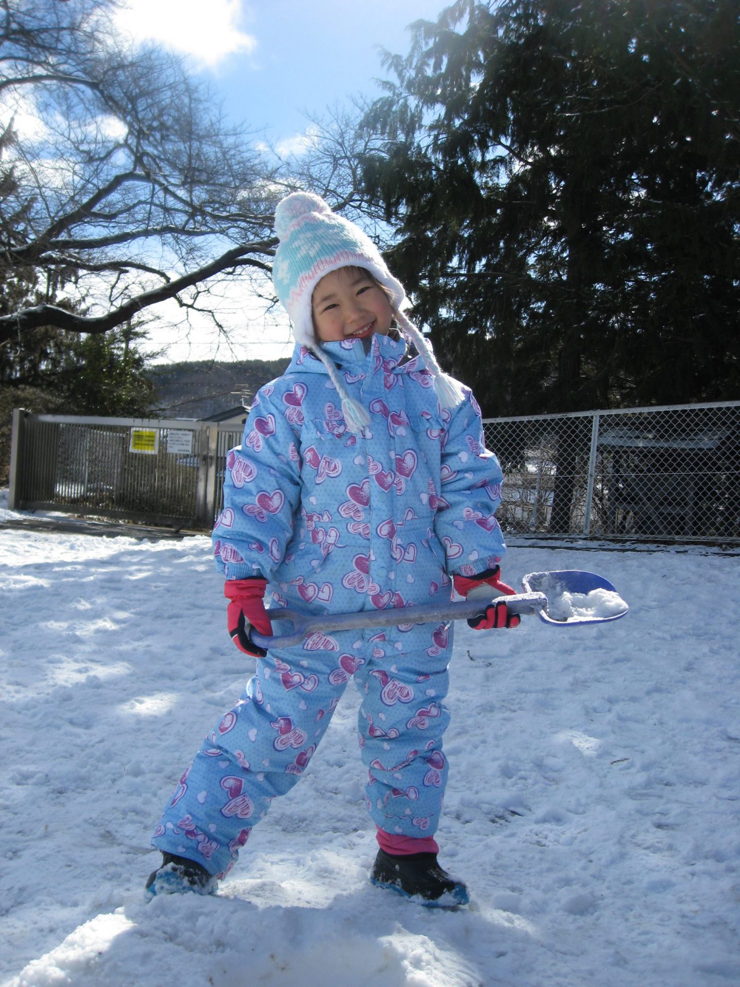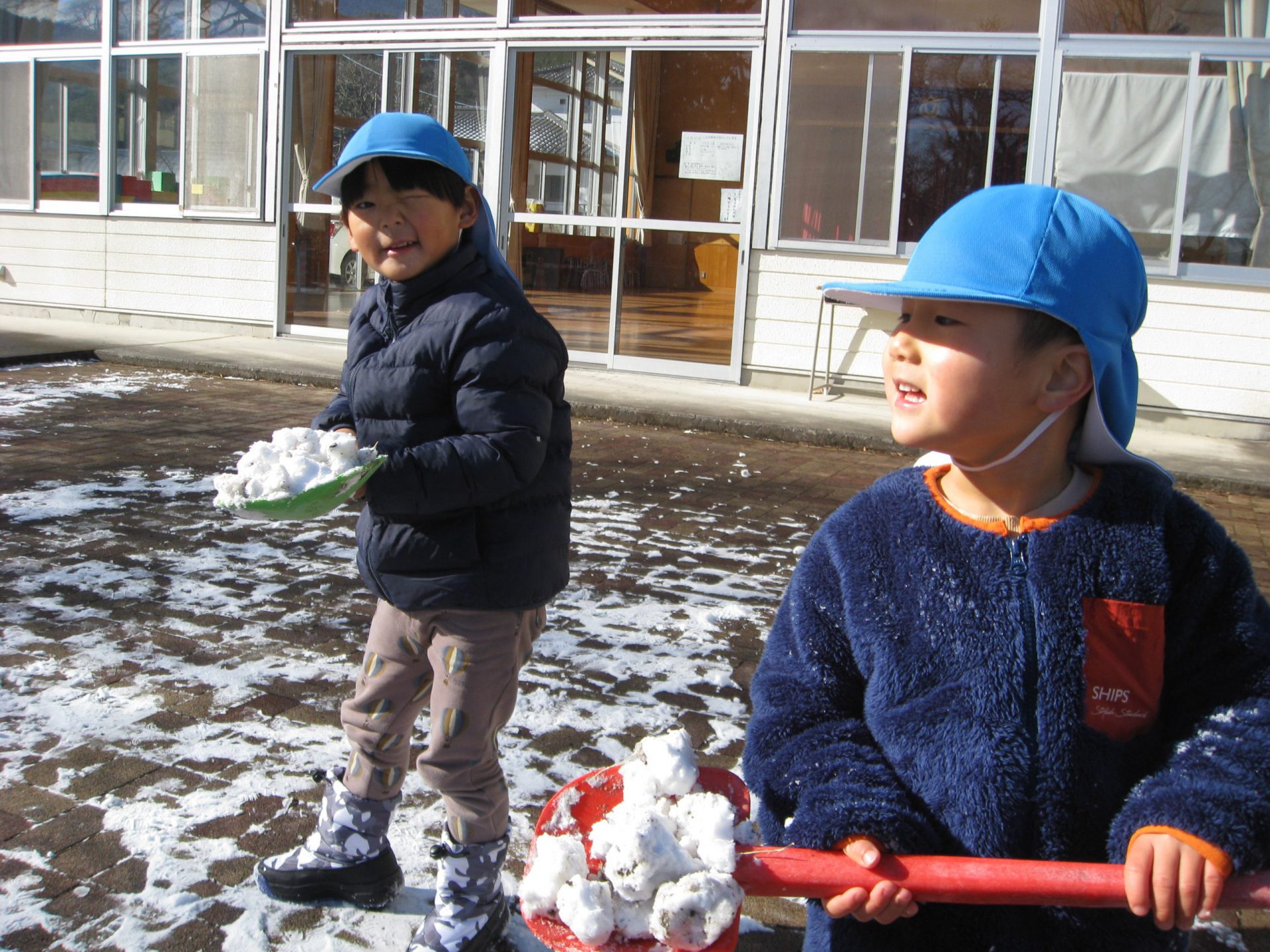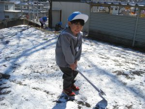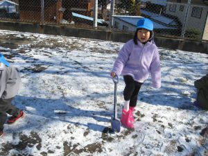 砂場のスコップを持ってきて、雪かきごっこをする子も!