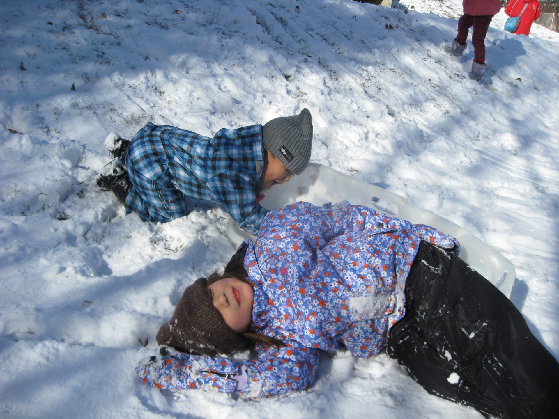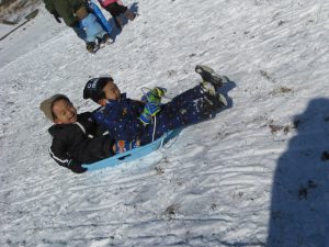「僕が押してあげるよ」と友だちをそりに乗せてあげたり