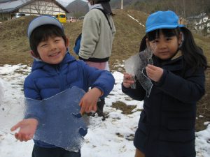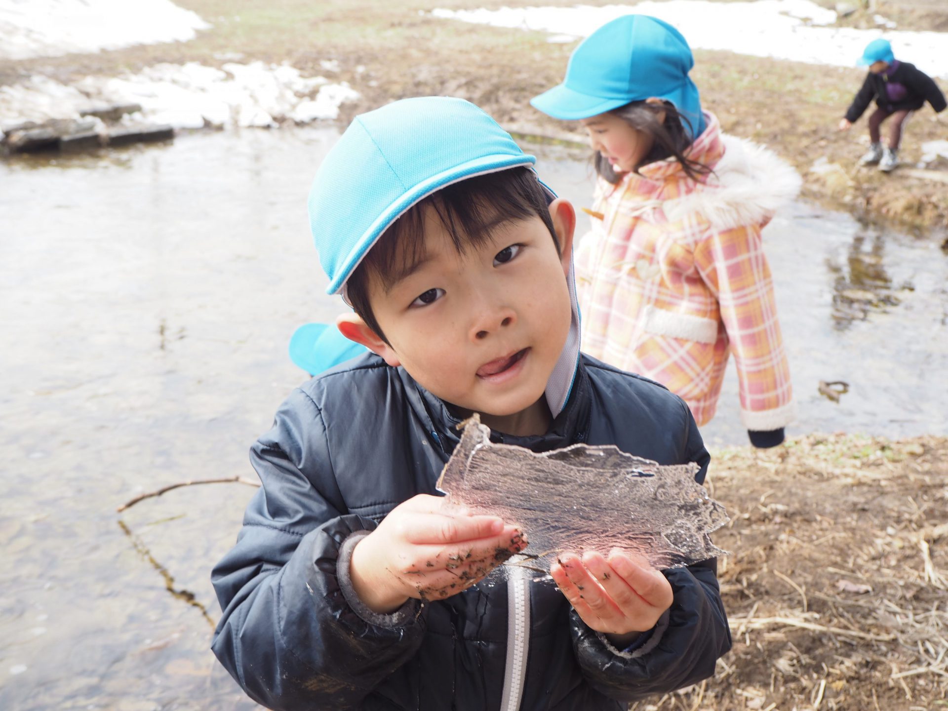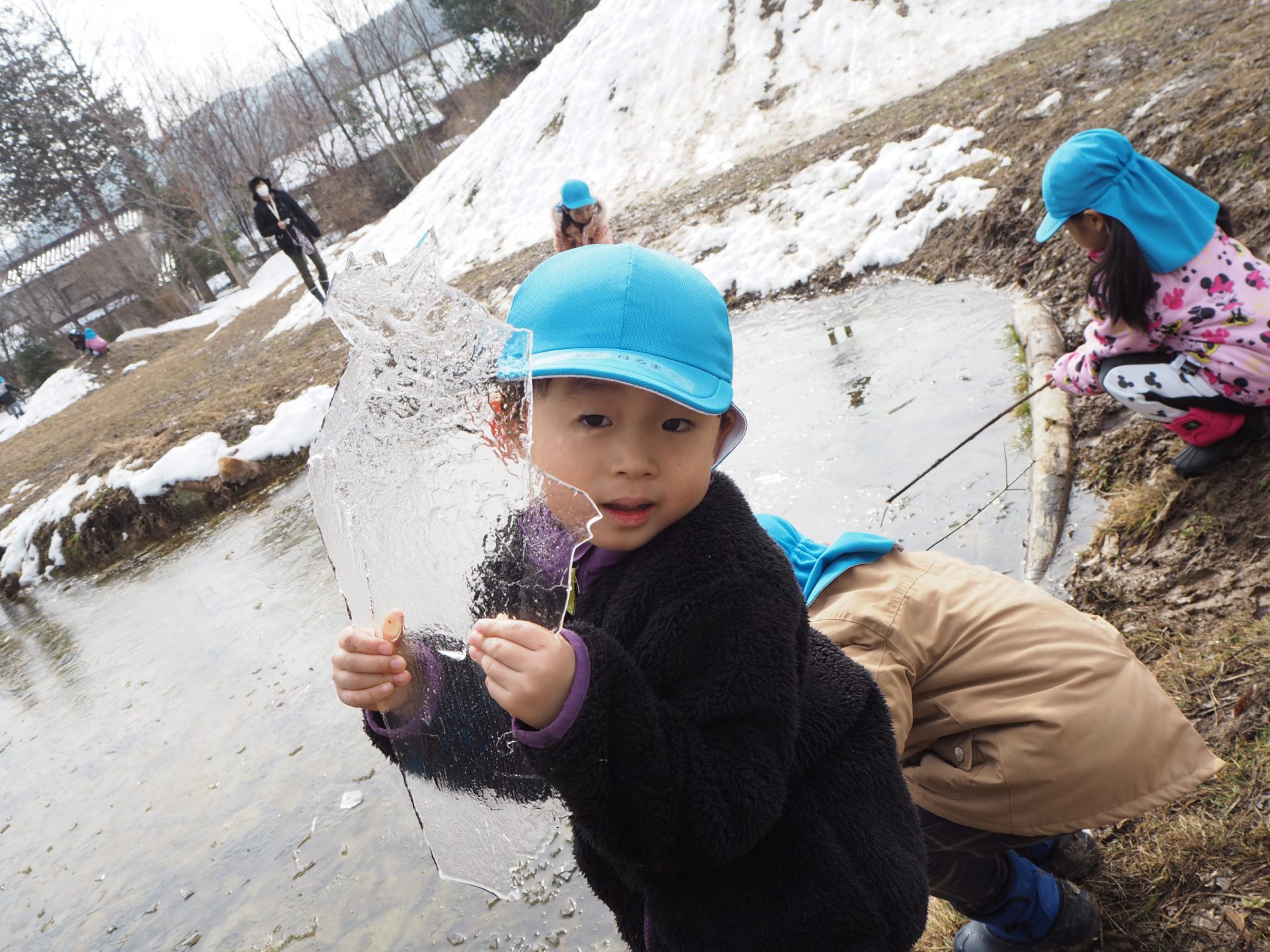保育園のすぐ裏にあるあおきっこ広場では川の水が凍っていて、