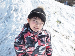 スキーウエアを着ているのでへっちゃらですが、冷たさも感じたようです。