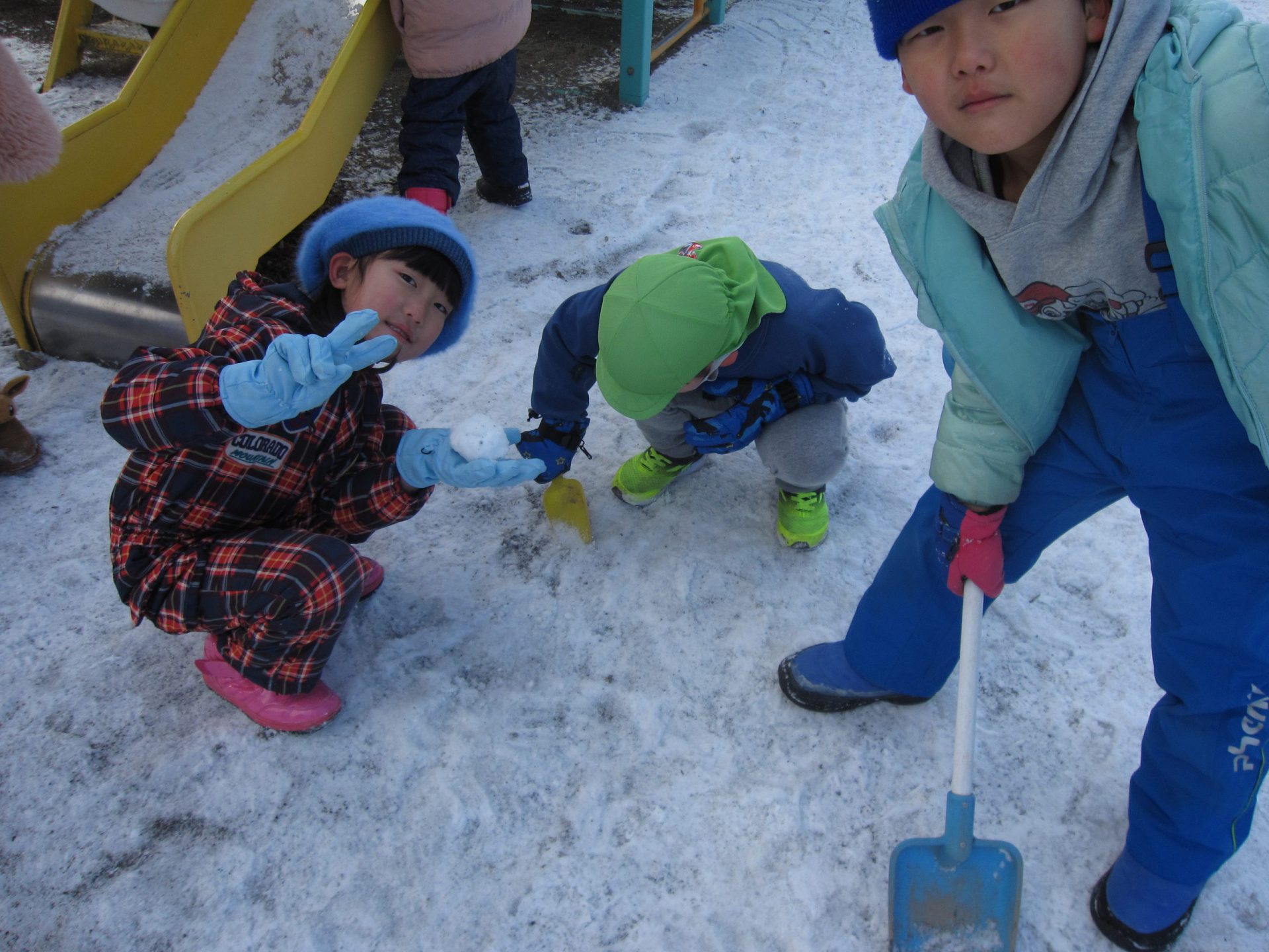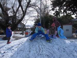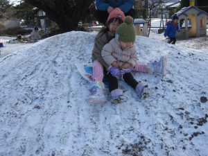 雪が降りました。園庭に積もった雪で雪遊びをしました!