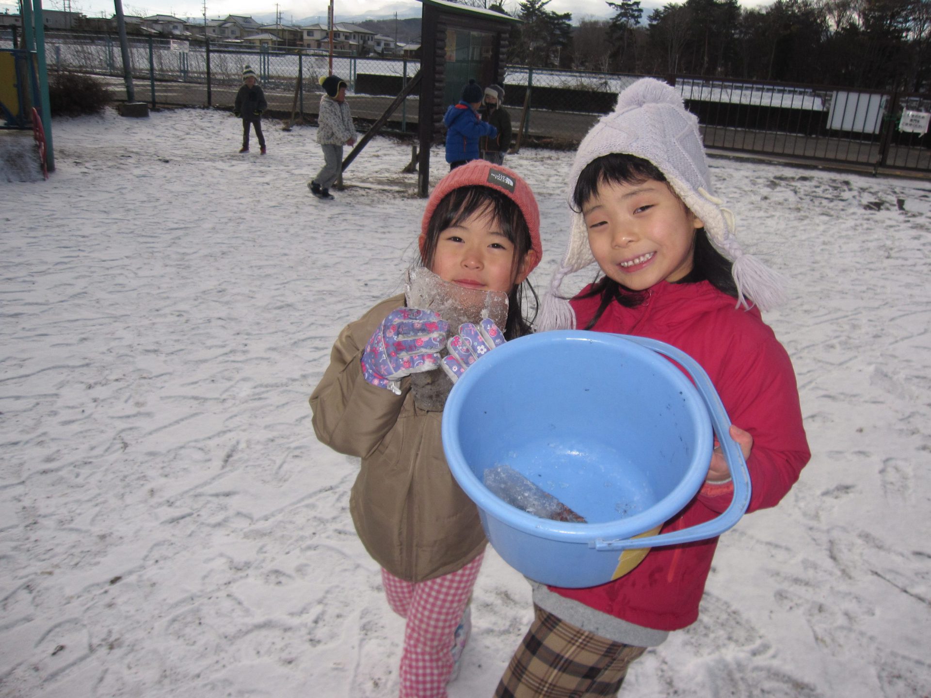 みんな、スノーウエアを着て、毛糸の帽子をかぶって、手袋をして準備完了です!
