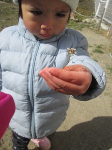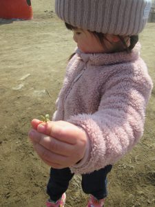 それを近くで見ていた他の子も小さなお花を探しに行き、見つけると、保育士の元へ行き見せてくれる子もいました。