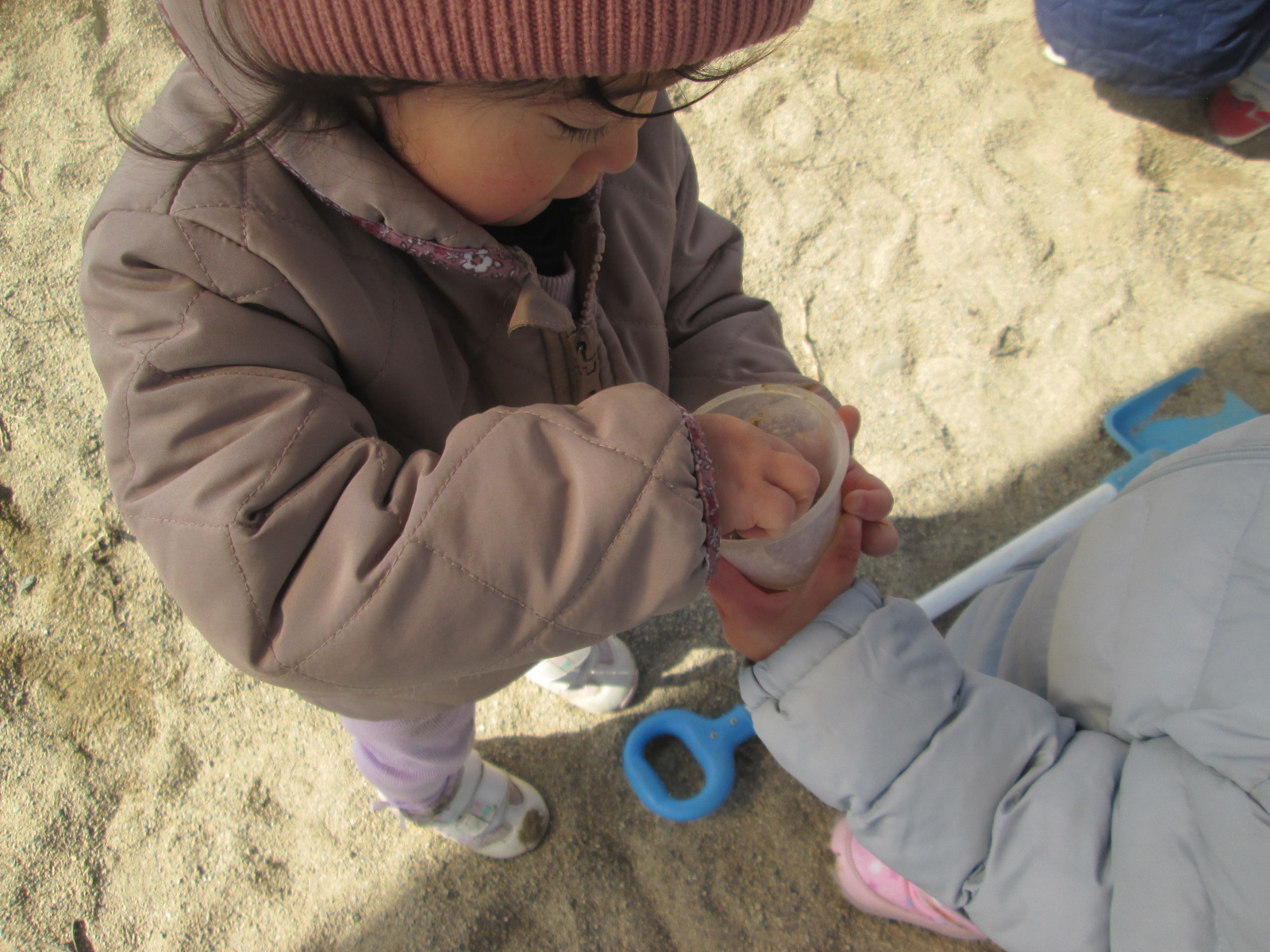 手で持ち歩くには小さすぎ、カップに入れてあげると、友だちの元へ行き、「見てー。」と見せに行く姿がありました。