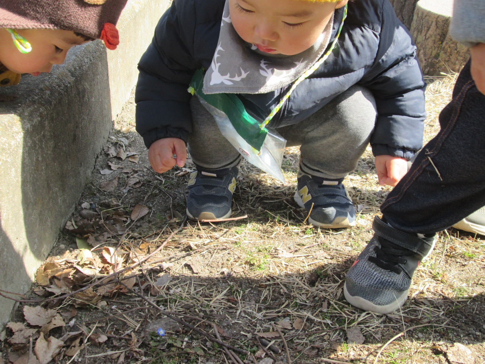 冬から春に移るこの時期の自然を見つけることは、0.1歳児には難しく、保育士に声をかけられて、やっとお花が咲いていることに気づきます。
