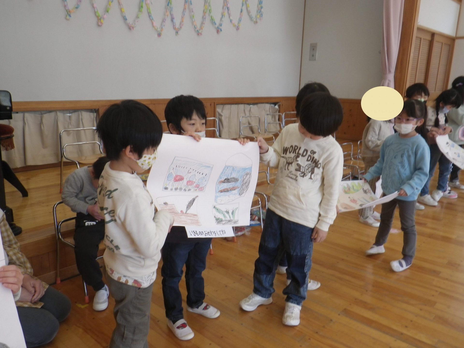 そこで、小さい組さんに「何かプレゼントしよう。」と今まで見つけた虫や花、木の実などの絵を描いて