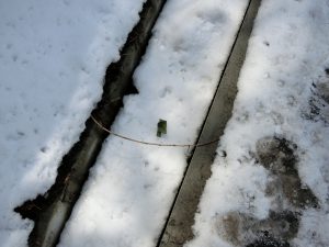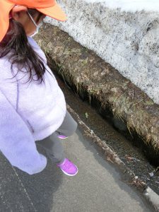 帰り道、笹舟を作りました。雪解け水で勢いがある側溝に入れてみると・・・