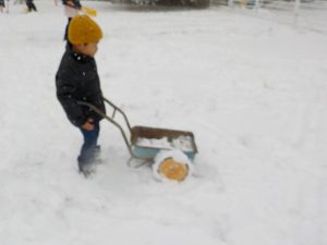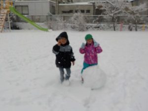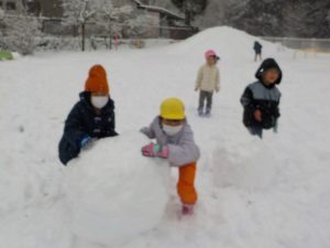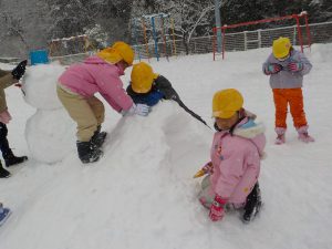 「大きい雪だるま作ろうよ。」雪だるま作りが始まりました。