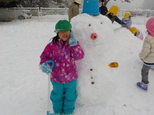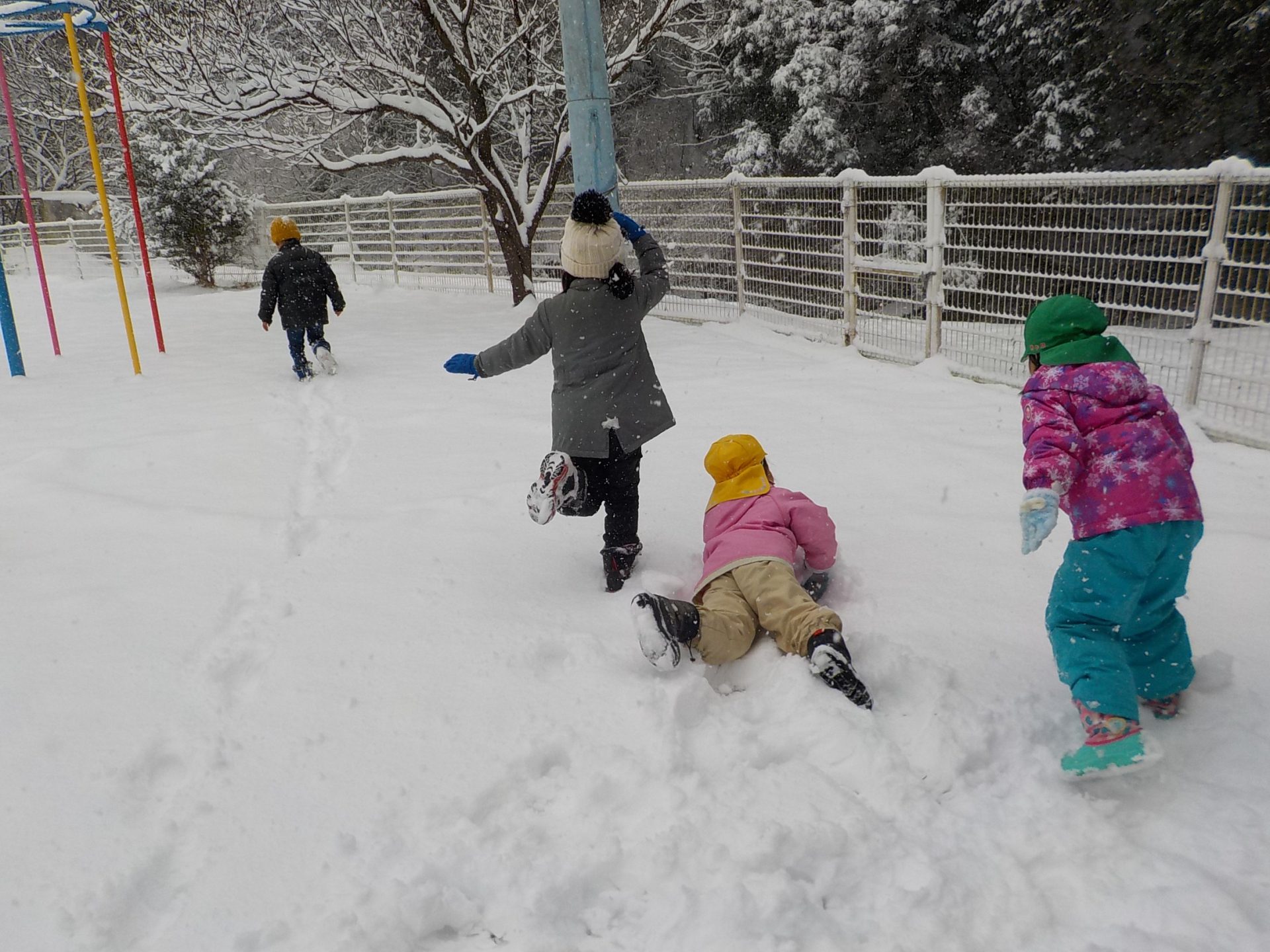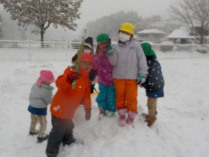 ソリ、雪だるま、かまくら作り、雪合戦など・・・冬の自然の中でいっぱい遊んだことで、。友だちと気づきや感動を共有したり、工夫しながら思いきり楽しむ経験をすることができた。これからも自然の中でたくさんの経験をしていってほしいと思います。