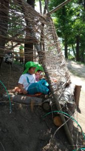蔦を使っての小屋作り。少しずつ編んで行きます。