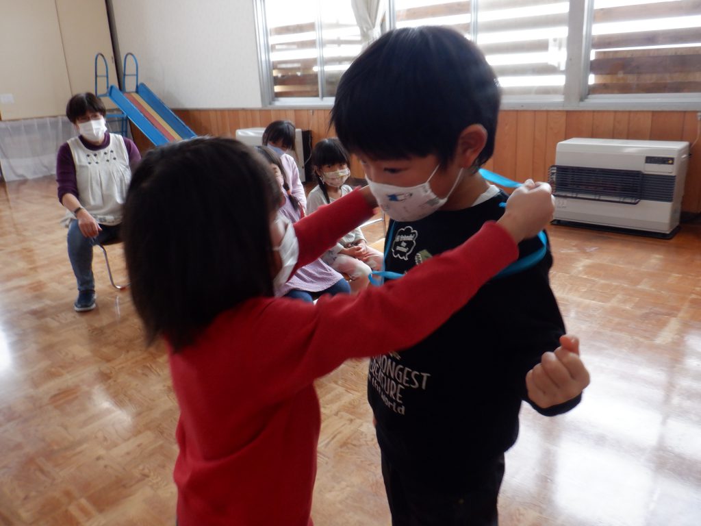 以上児は3・4・5歳混合クラス、また、この少ない人数の中であるからこそ、友達一人ひとりに親しみを持ち、学年を越えて関わり合う姿が日々の中で多く見られました。