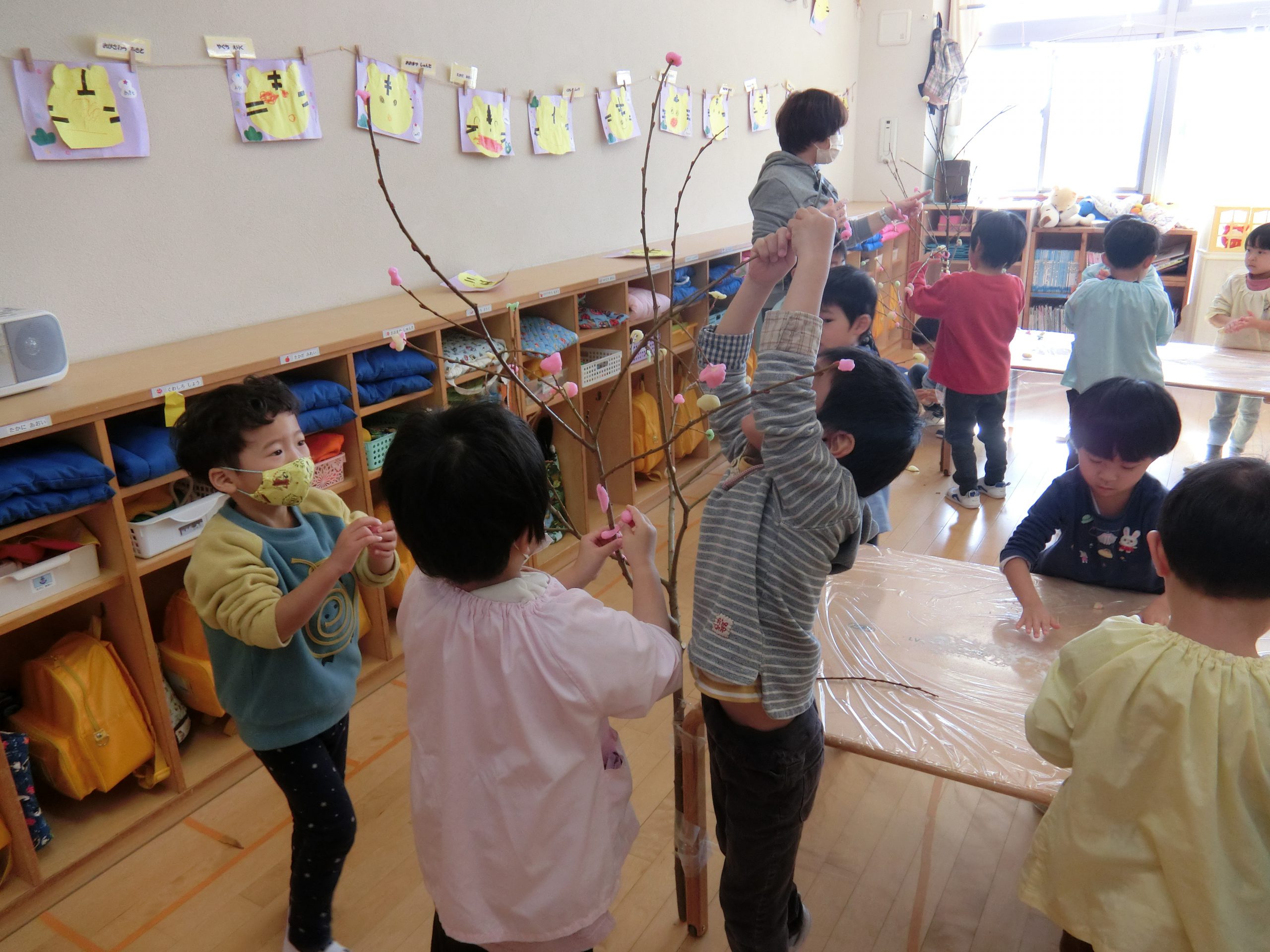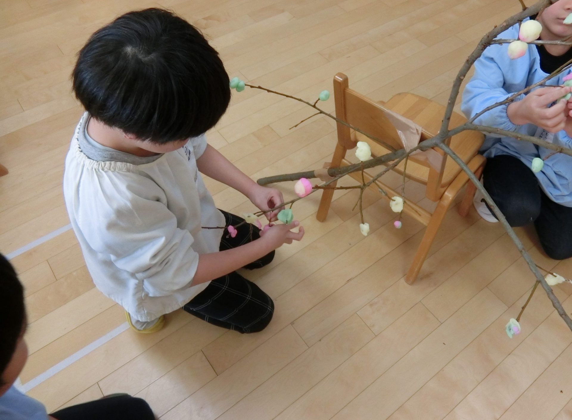 1月の誕生会では、まゆ玉の由来について知り、各クラスまゆ玉作りを行いました。