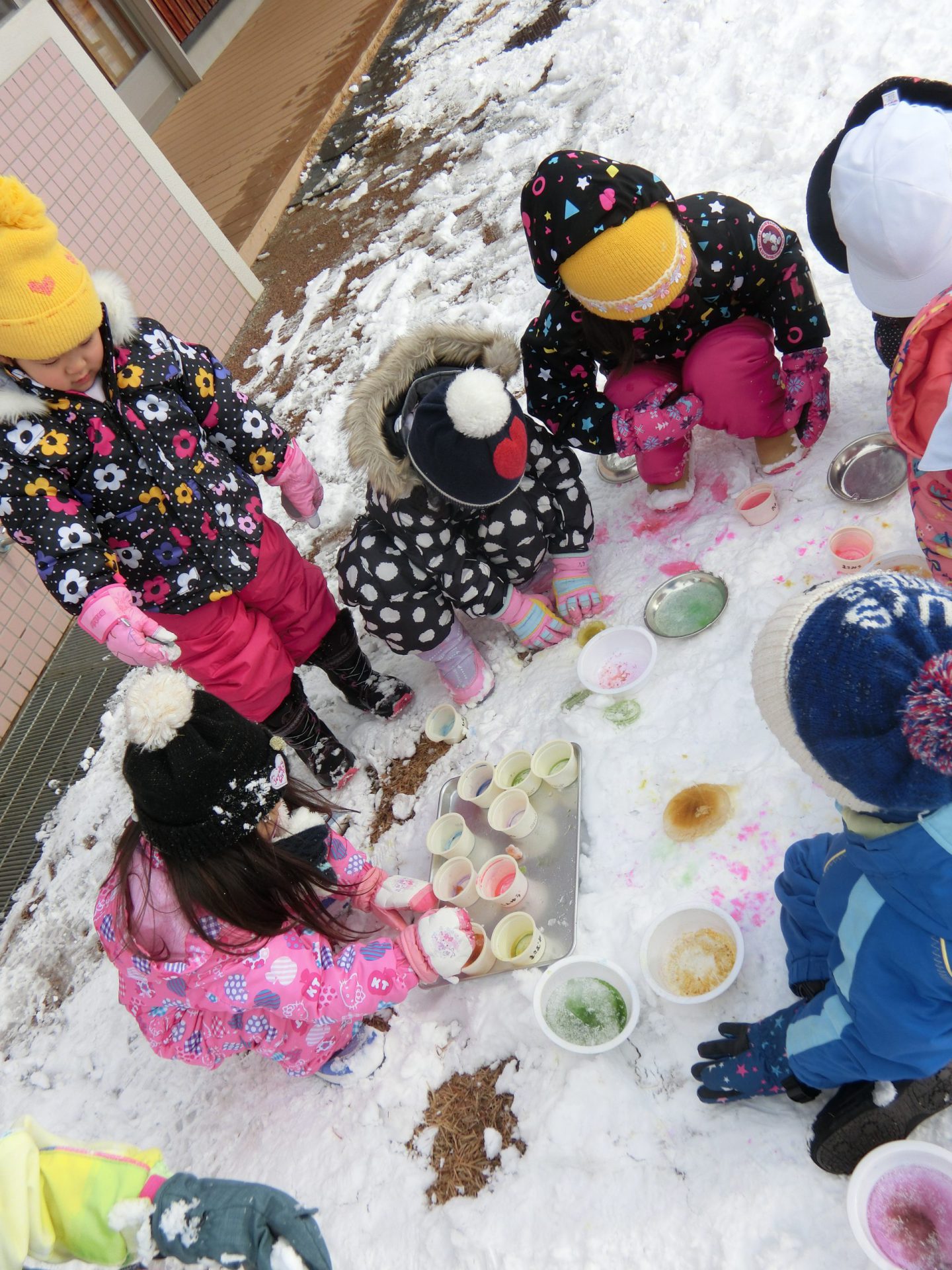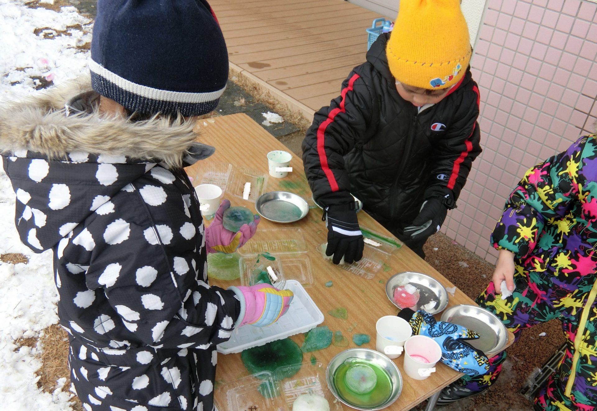 出来た氷は溶かしたり削ったり、雪に混ぜて色を付けたり。