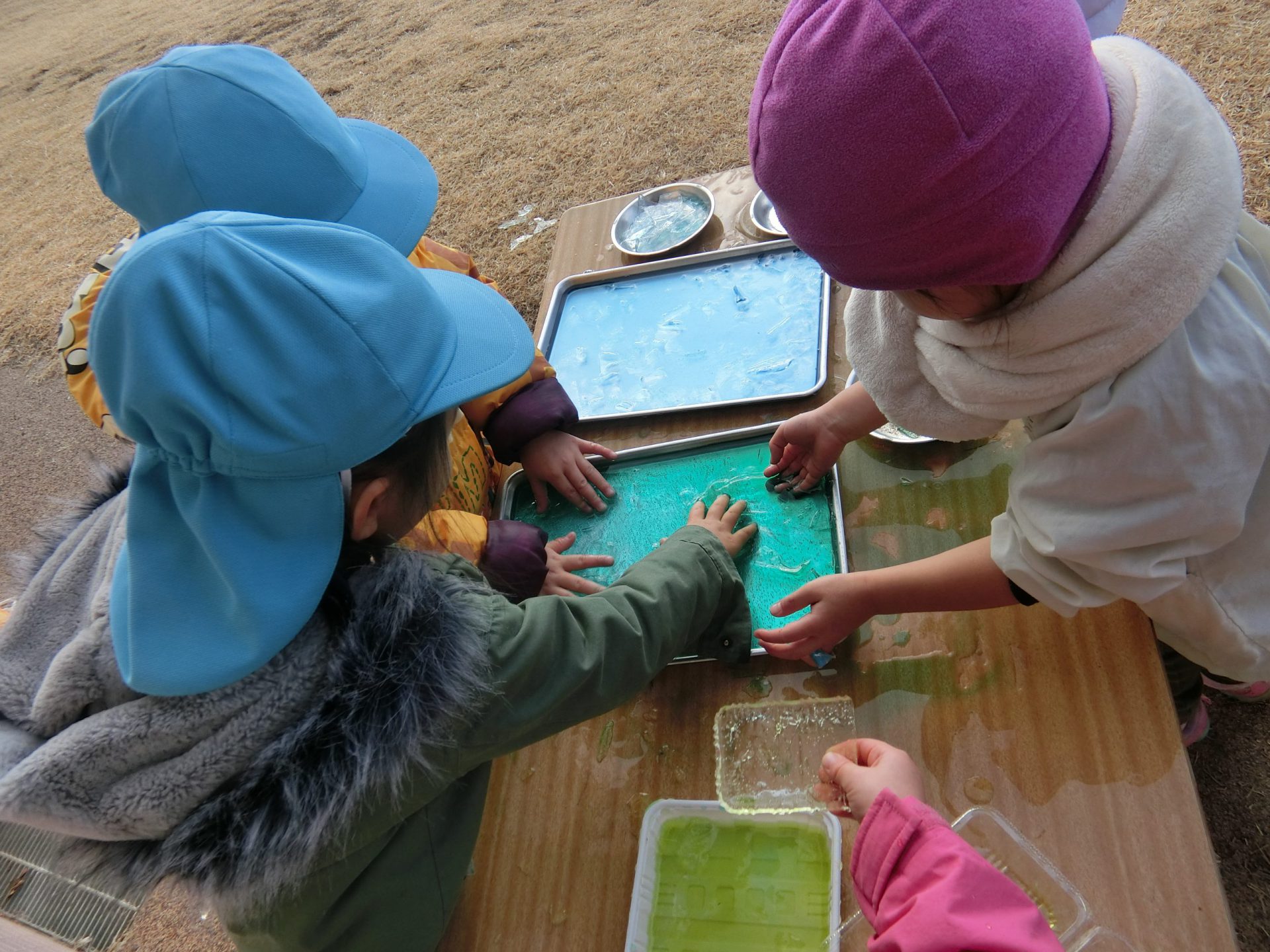・寒くなると氷ができるという冬の自然現象に気が付きました。子どもたちなりに、氷が“できる”“できない”を基準として、寒さを感じる姿が見られました。
