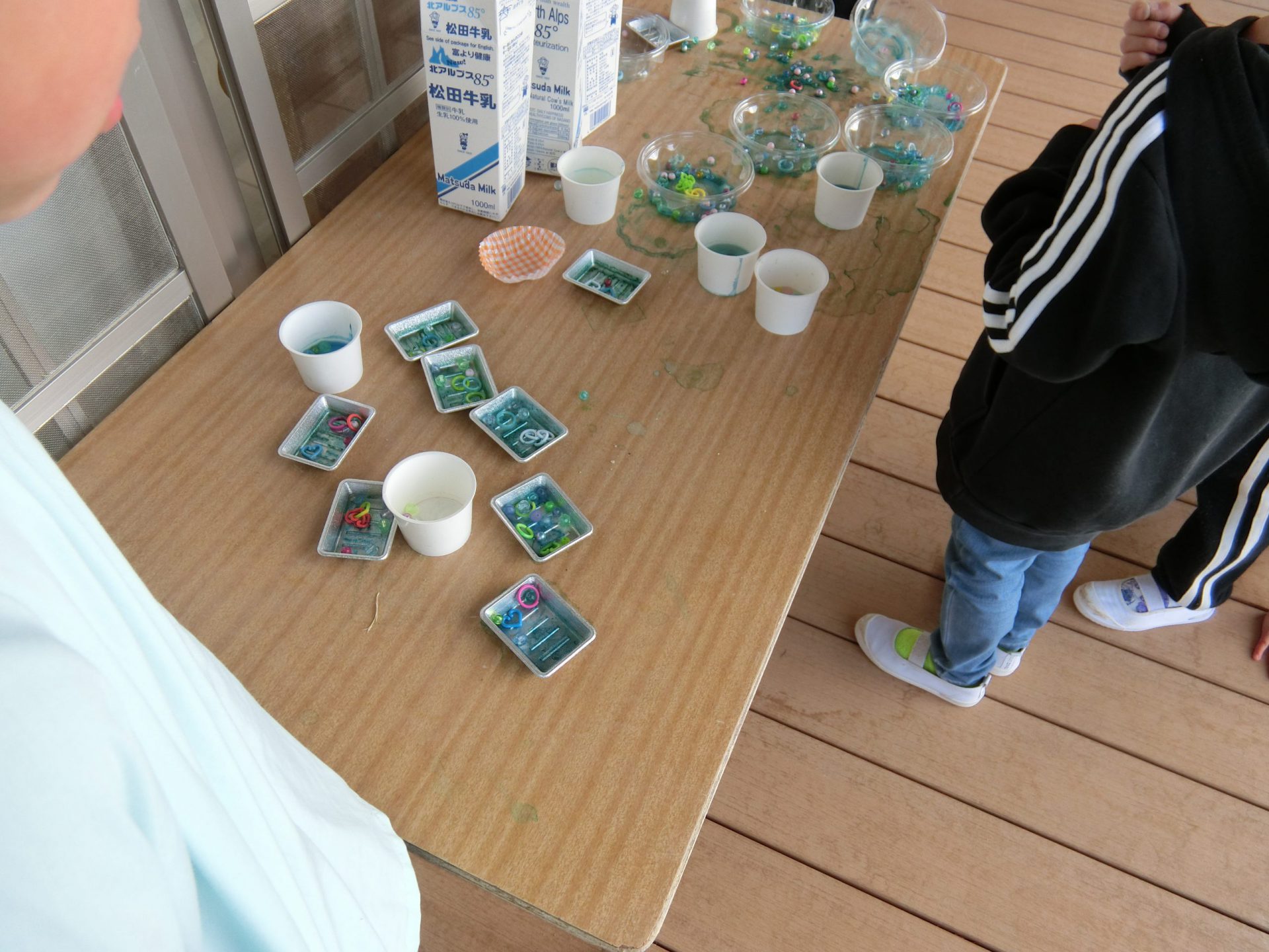 自分たちで食紅の色水を混ぜ、好きな色を作ったり、ビーズやリングを入れてみたり…