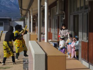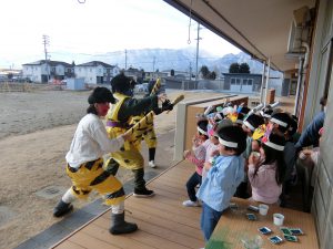鬼が来てびっくりの年少さん、必死に豆を投げる年中、年長さん!
