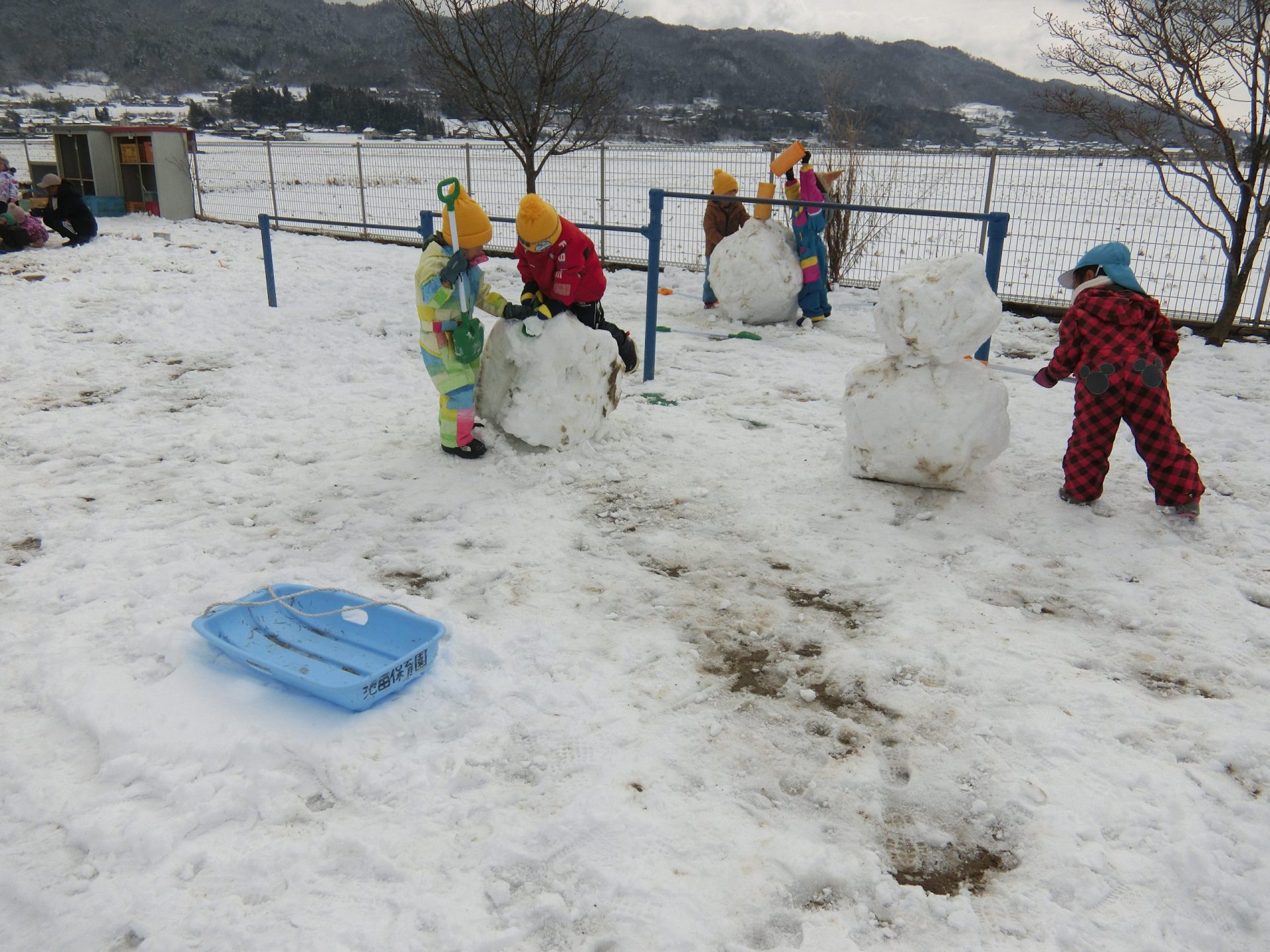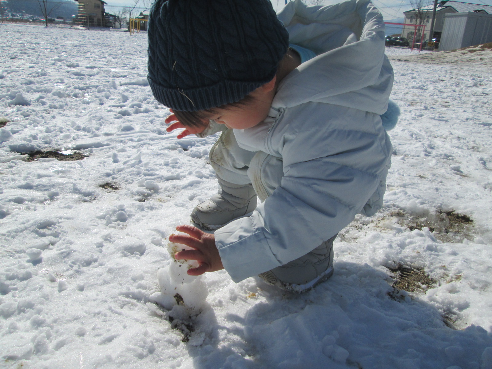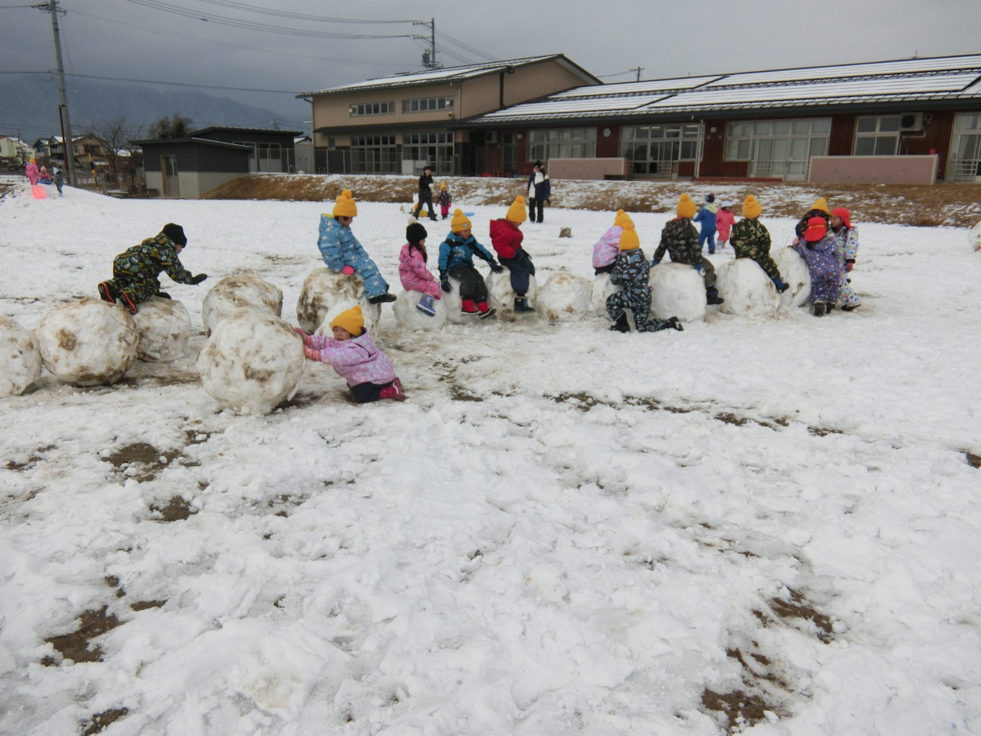 雪がたくさん積もった日には大きな雪玉作りが始まりました。