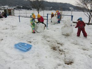 ・雪はフワフワしているけれど、大きくすると重くて固い!そんなことに気が付いた子どもたちです。雪玉の上に乗っても平気です。