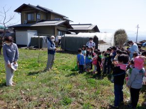 お世話になるお宅のおじいさん、おばあさんがお出迎えをしてくださいました。「田んぼの脇道にたくさん生えているからね」「下のほうから株ごと採ると上手だよ」と教えてもらうと、子ども達は「こんなふう?」「葉っぱがくっついたまま採れた!」と張り切って摘み始めました。おじいさん達のお隣でにこにこと嬉しそうでした。