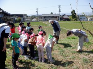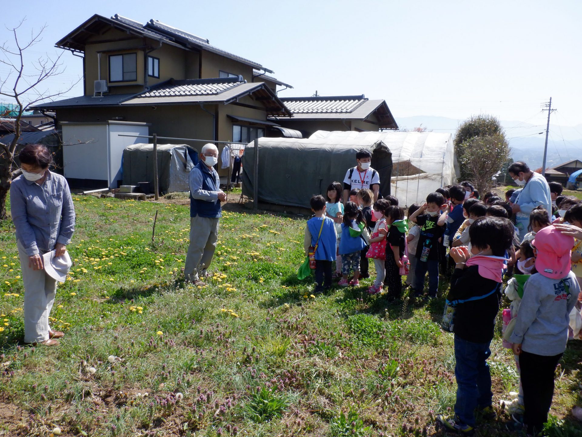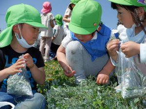 毎年ヨモギ摘みを体験させてくださる地域の方のお宅へ、年中さんと年長さんがお邪魔しに行ってきました。後日の園のおやつに‟よもぎおやき”が出てきます。給食先生に美味しく作ってもらうため、「たくさん摘んでこなきゃ!」と気合十分の子ども達。年長さんは去年の経験もあって、「葉っぱが白い色してるんだよね」「草のお餅に入ってるやつだよ」と道中で年中さんに話してくれている姿もありました。