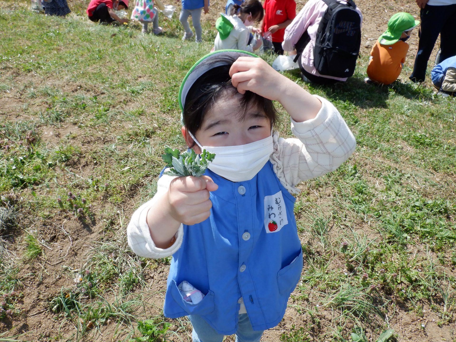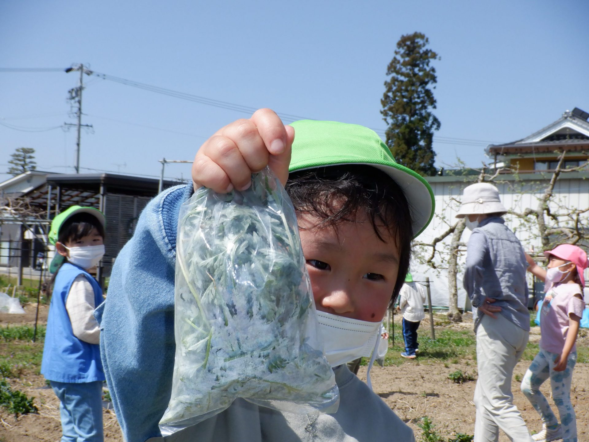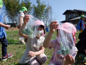 手に持っていたビニール袋いっぱいに摘んで大喜びの子もいれば、黙々と地面に視線を落として摘み続ける子もいました。楽しみ方はそれぞれですね。保育園で待っている年少さんと未満さんのことを思って「小さい子が待ってるからね、頑張らなきゃ」と呟く姿もあり、新しい年度がスタートして一つ大きくなったからこその心の成長も垣間見えるようでした。