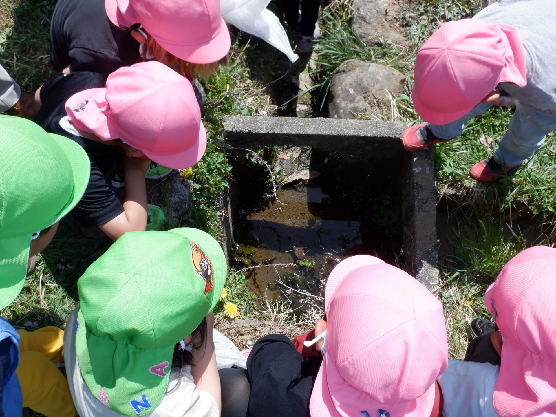 袋がいっぱいになってきた頃には、「あ!テントウムシいたよ!」「カエルが跳ねた!そっち行ったに!」「ここにはドジョウも泳いでる!」と田んぼ周りの小さな生き物との出会いに喜び、みんなで捕獲大作戦が始まりました。
