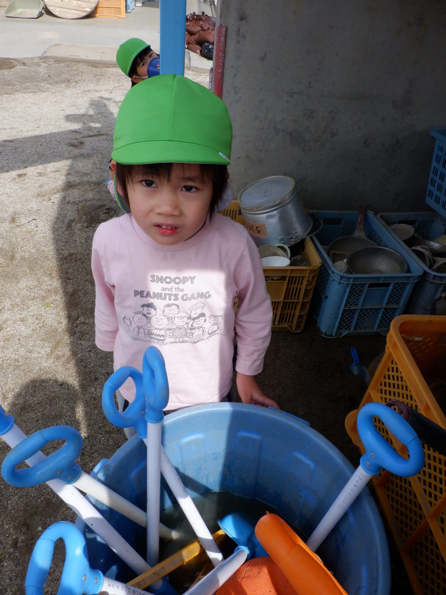 あれ・・・?シャベルを使おうと思って取りに来たら、入れ物の中に水がいっぱーい!