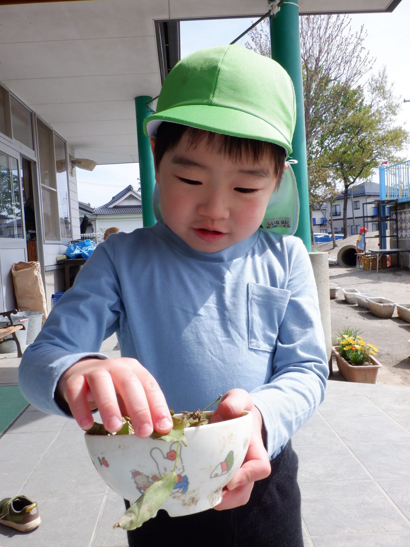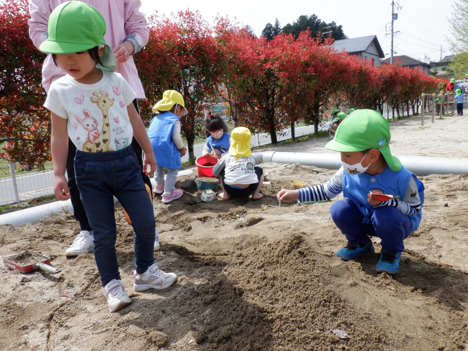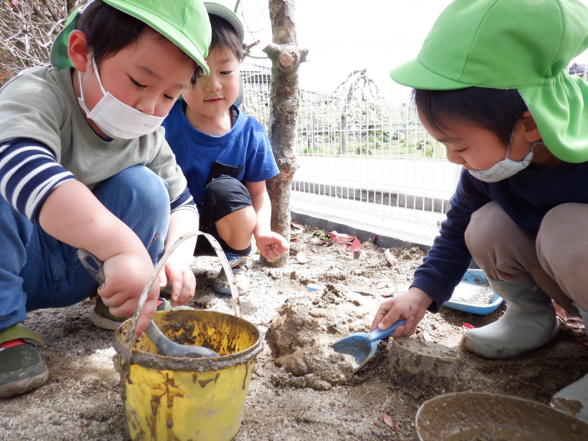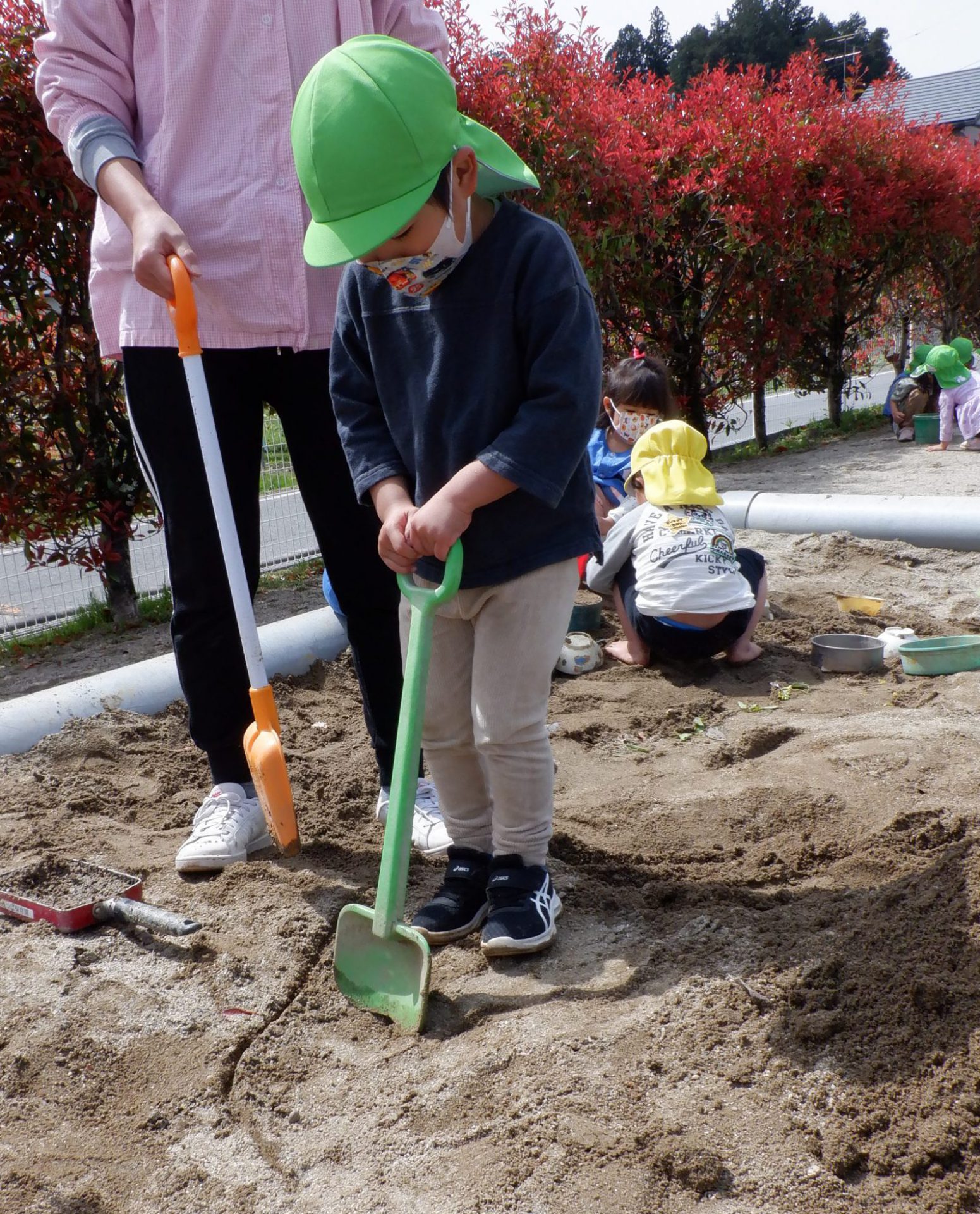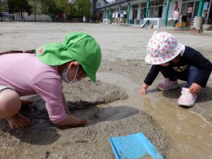 隣で様子を見ていた未満児さんが真似して泥を触る様子もあり、微笑ましかったです。お兄さん・お姉さんたち、楽しそうなことしてるもんね😊