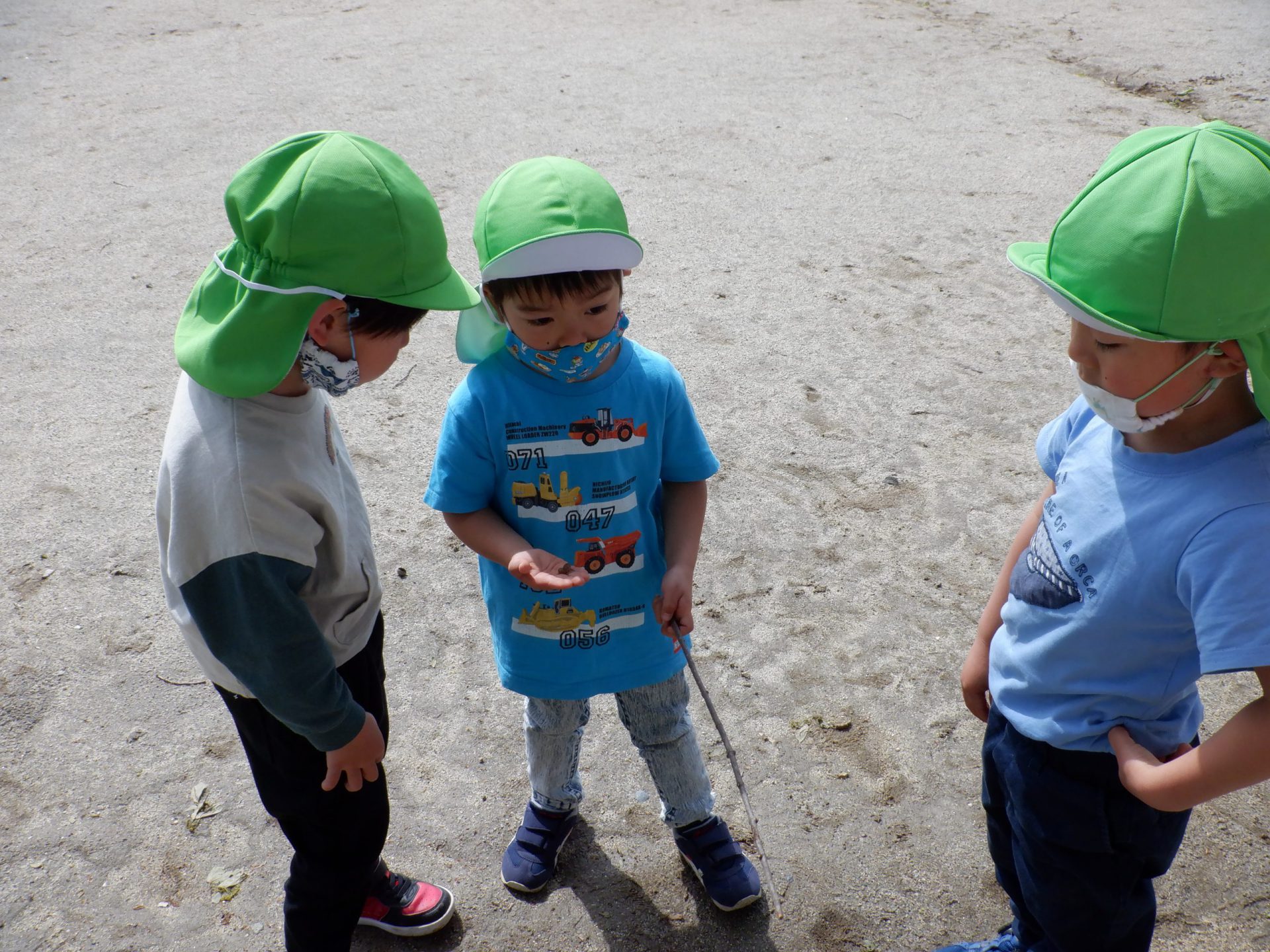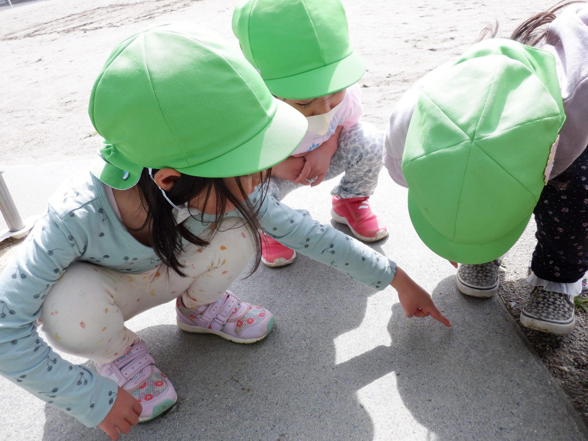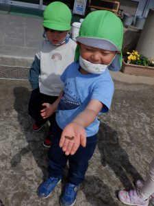 あまりにいいお天気で、虫たちも園庭へお出かけに来たようです。子どもたちは所々でしゃがみこんでは虫を観察したり、捕まえて集めてみたり・・・と夢中になっています。