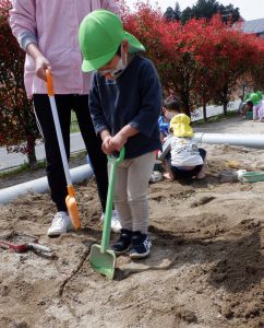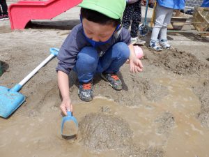 え~、とってもおいしそう!自分たちで水と砂・土を混ぜ合わせて、とっても濃厚そうなケーキが作られていました。すると、「とろけるぅ~」とその様子を見に来て呟くお友だち。美味しそうなケーキを表現するのにまさに的確な言葉選び!時に子どもたちの言葉の表現の豊かさには驚きと感動を覚えます。