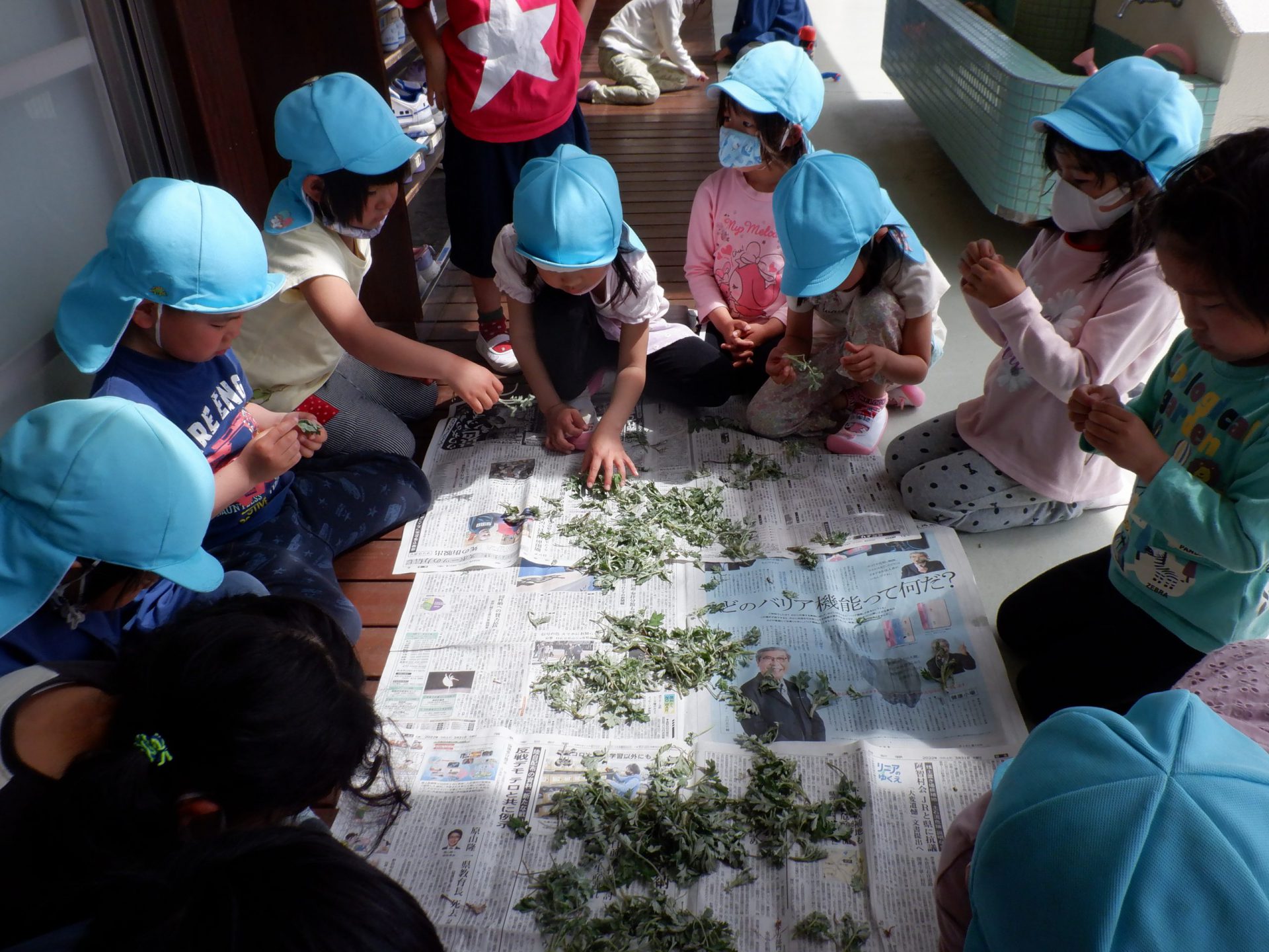 保育園に帰ってくると、年長児が採ってきたよもぎの下処置をしてくれました。