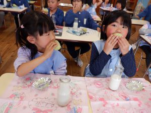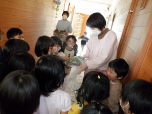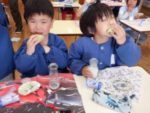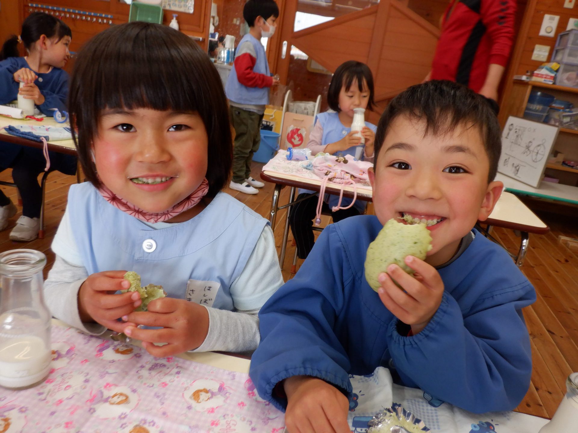 後日・・・「明日はよもぎのおやつだ!」と前日から楽しみにしていた子どもたち。給食先生が美味しいよもぎ蒸しパンにしてくれ、みんなで喜んで食べました。